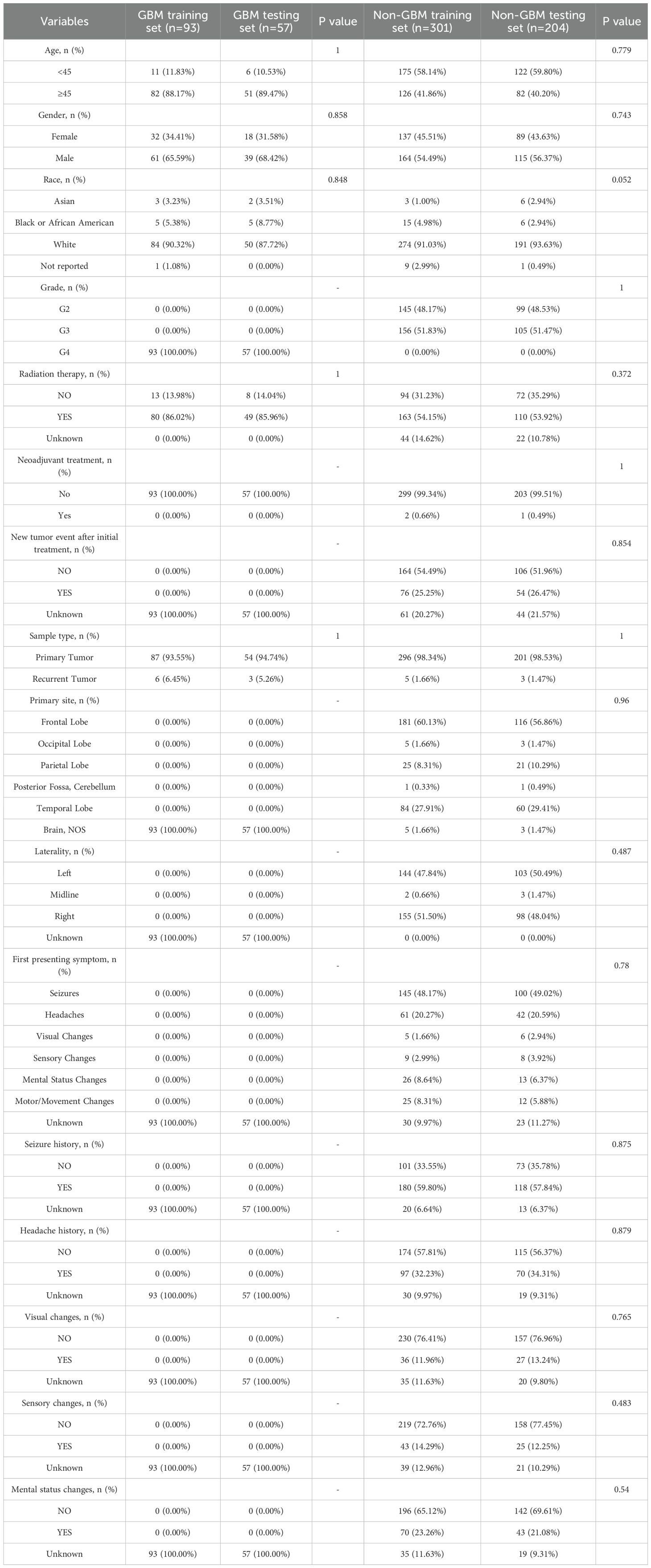 For external validation, an independent cohort of 655 glioma patients from the CGGA was used. Pathological classification into GBM and non-GBM groups followed the same criteria. The baseline clinical characteristics of the CGGA cohort are presented in Table 2.