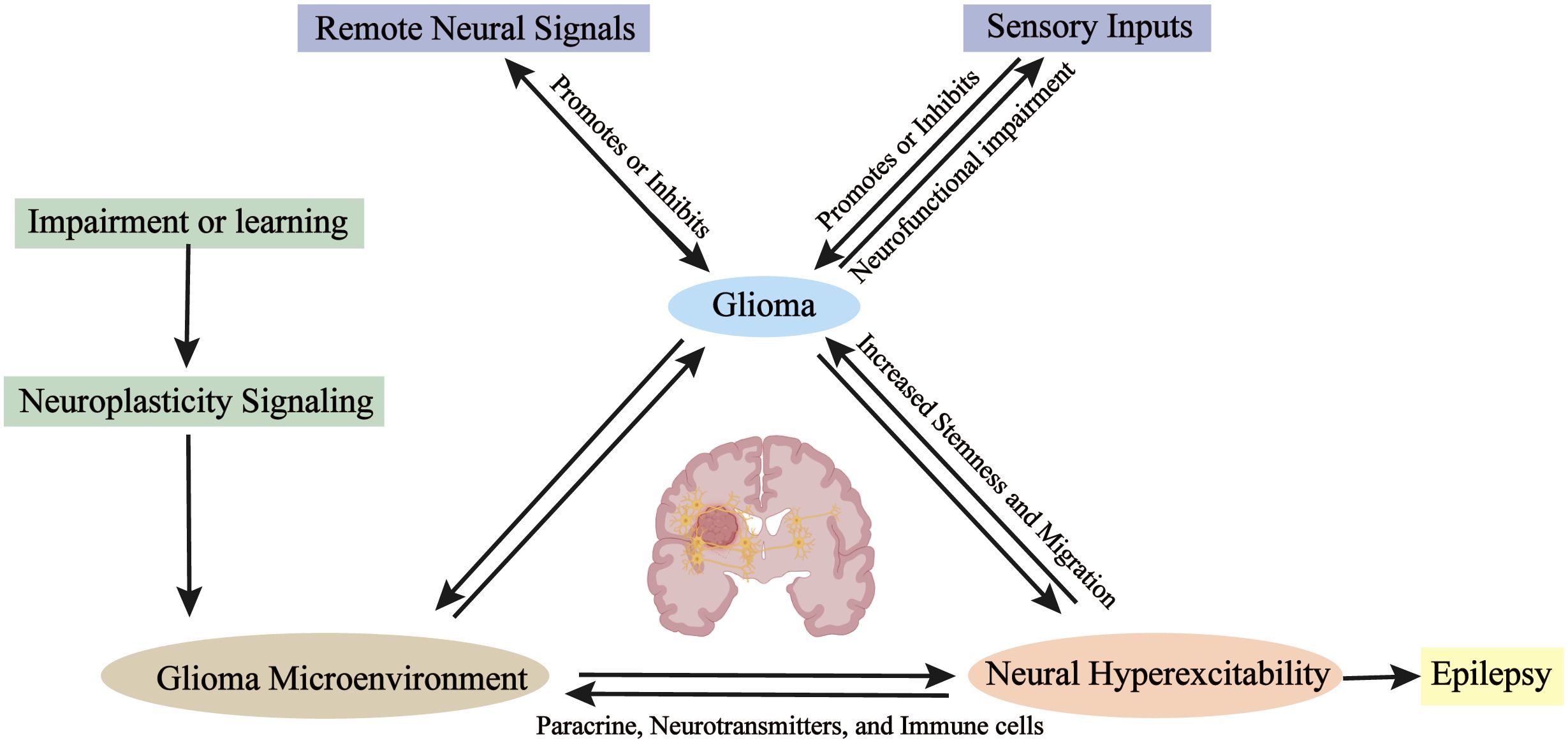 Overall, while glioma growth stimulates immune cell repair and participates in neural remodeling, signaling impulses from neurons can, in turn, facilitate this process. However, this process seems to be exploited by the glioma cells for the use of self-growth.
