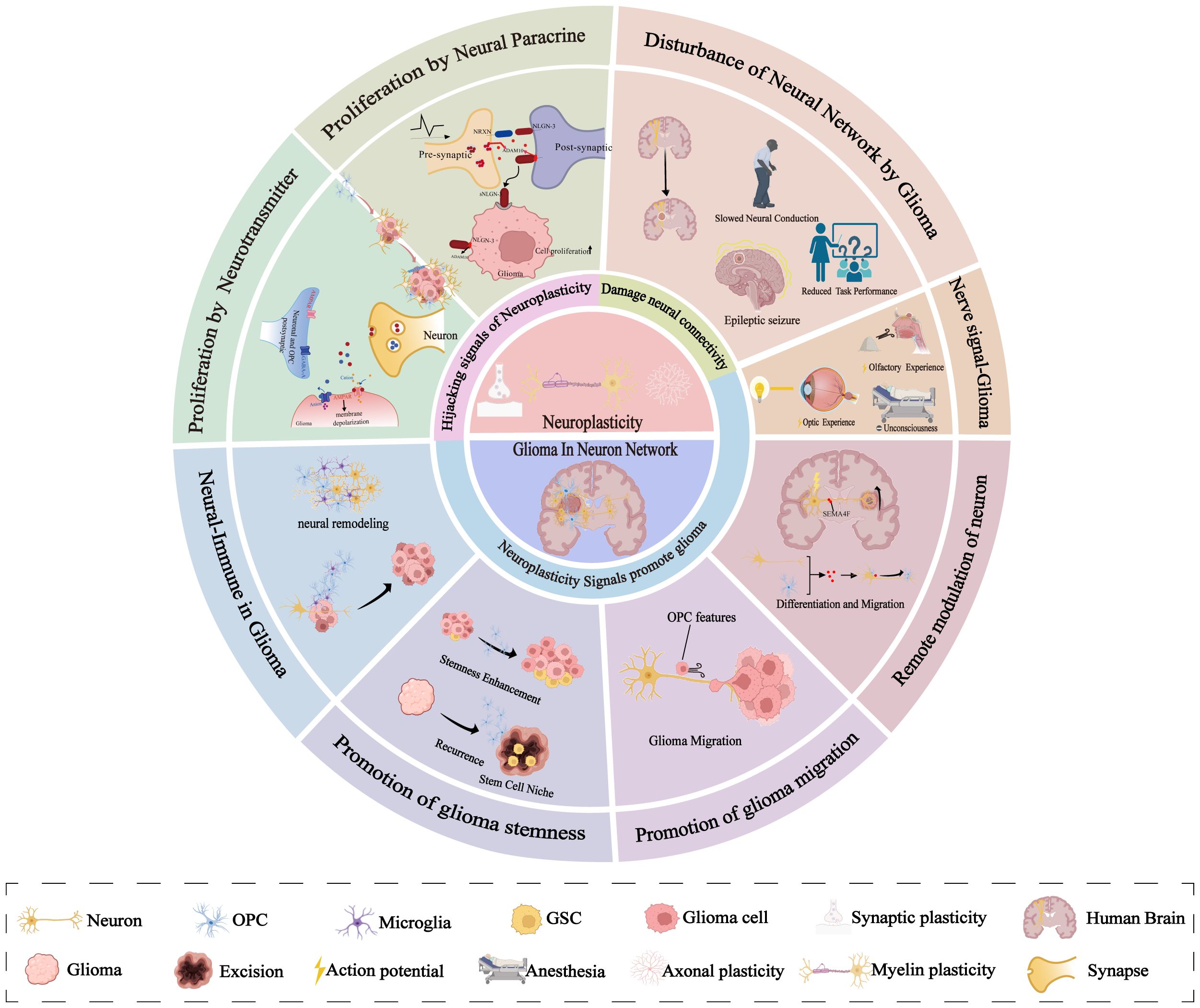 Figure 1. Specific aspects of glioma-neuron interactions and neural plasticity. Neural plasticity governs myelin, axon, and synaptic remodeling via neuronal signaling, with gliomas preferentially arising in highly plastic regions. Gliomas hijack neural stem cell repair mechanisms—forming synapses to receive neurotransmitters and paracrine factors—while neural inputs (e.g., visual/olfactory stimuli, anesthesia) significantly impact glioma growth. Bidirectional glioma-neuron communication drives epileptogenesis and impairs functions. Distant neurons participate via neural networks. Neuronal signals enhance glioma cell migration and the acquisition of stem-like properties. Neurons also indirectly regulate gliomas through immune cell crosstalk.