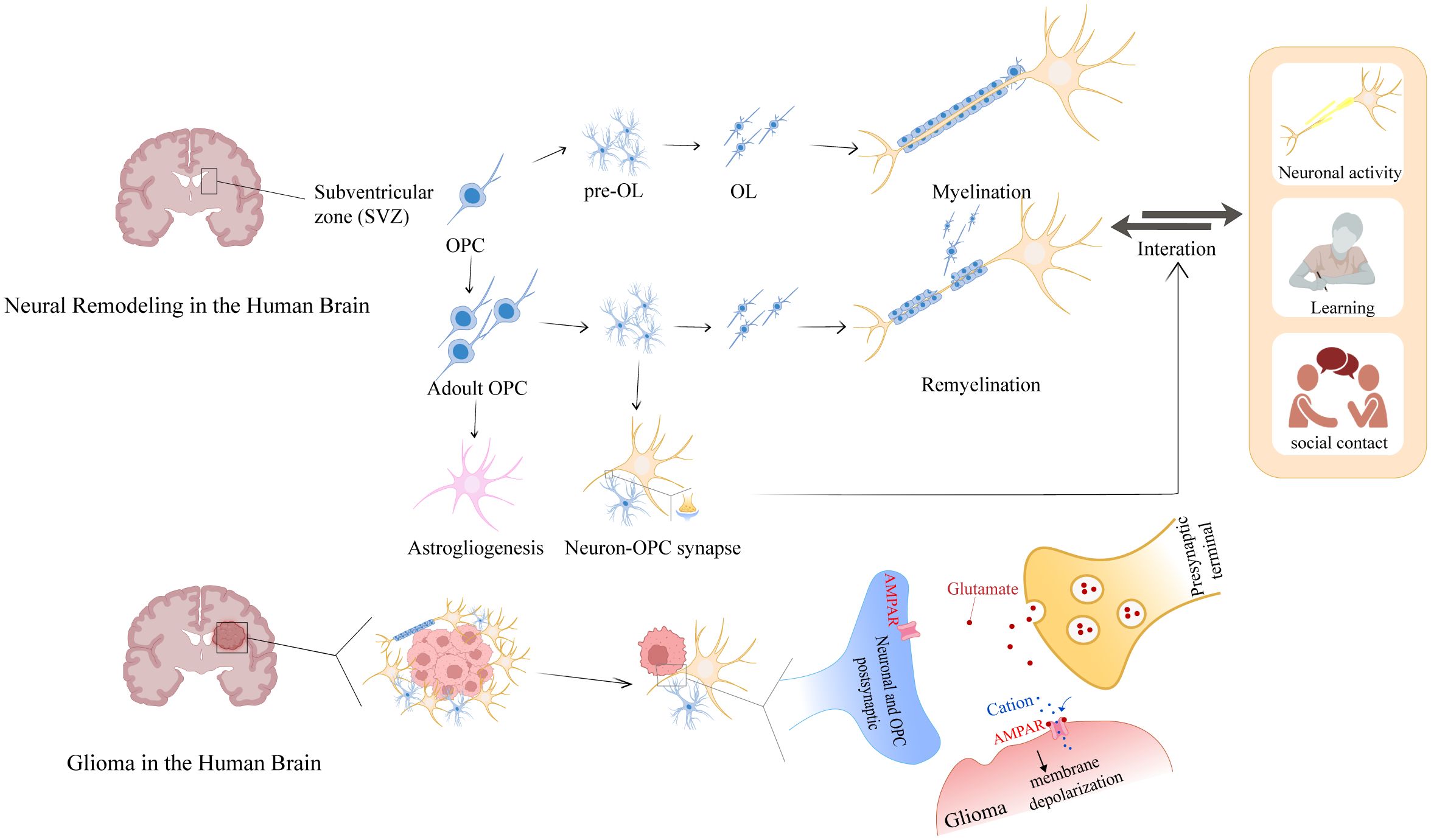 The underlying mechanism of this OPC aggregation—whether driven by reparative recruitment or malignant transformation during the initial repair process—remains inconclusive. Mosaic Analysis with Double Markers (MADM)-based lineage tracing revealed significant abnormal growth prior to malignancy only in OPCs (129). Notably, accumulating evidence has established that OPC aggregation significantly accelerates glioma progression. Stem cells not only have the mission of proliferation and differentiation but also require multiple factors (e.g., neuroregulatory signals, paracrine factors) to promote or inhibit the function (130). Similarly, in gliomas, the factors that regulate OPC also regulate the glioma cells and even form similar synaptic connections. It seems that brain cancer learns the mechanisms of neural plasticity.
