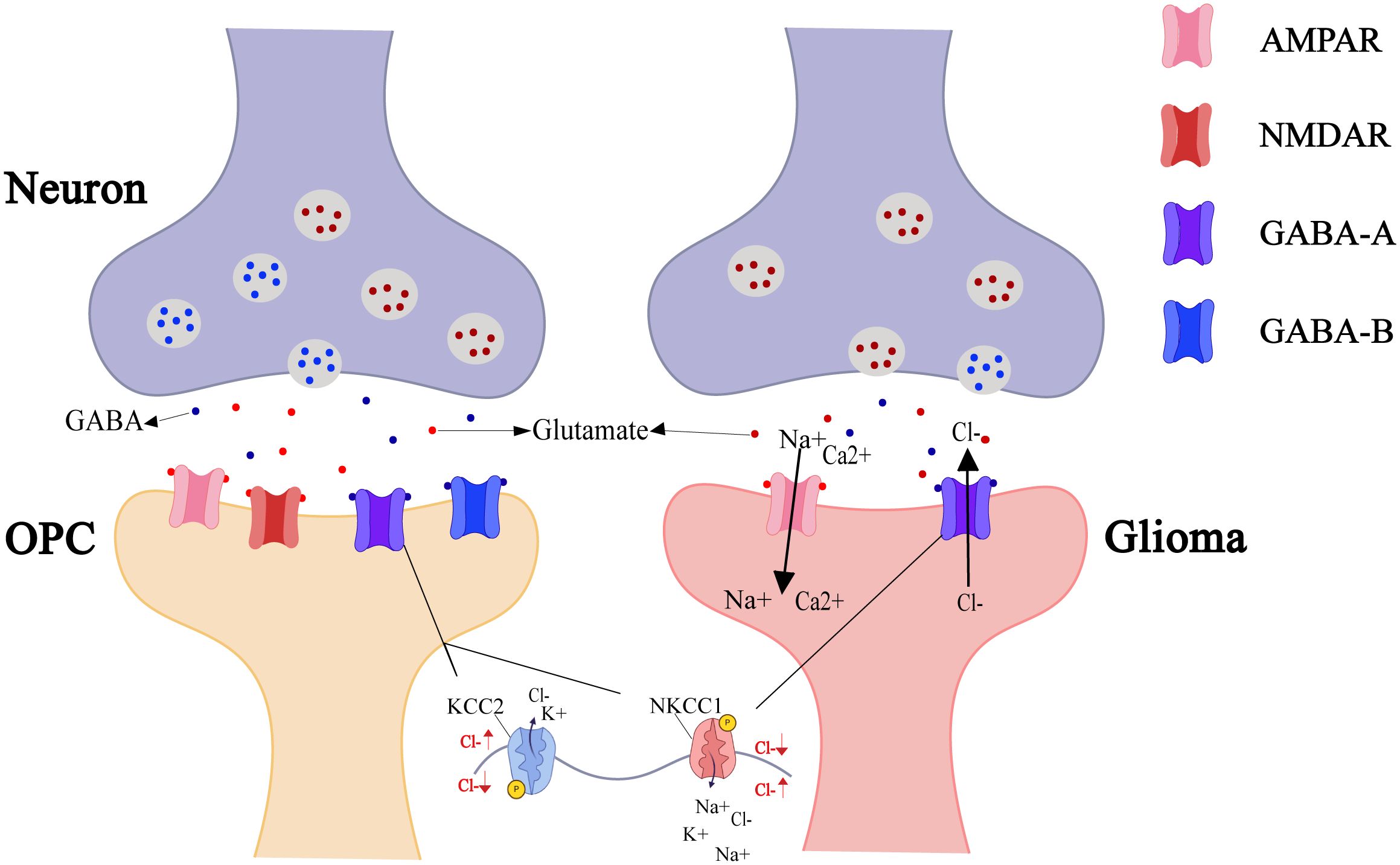 Neuron-glioma signal transmission occurs via calcium permeable AMPA receptors. Glutamate released from presynaptic membranes triggers depolarization by activating AMPARs on glioma cell membranes, with receptor inhibitors significantly impeding synaptic communication (7). Similarly, neuronal activity that promotes OPC myelination also involves AMPA glutamate receptors (50). However, in addition to glutamatergic synapses, GABAergic synapses have recently been discovered between gliomas and neurons, with both types able to coexist on a single glioma cell (51). Similar to OPCs in the early developmental stage, the Na-K-2Cl cotransporter (NKCC1) elevates Cl− levels in glioma cells (52), which tends to an efflux of Cl− upon activation of GABAARs. Therefore, GABAergic neuron-to-OPC and GABAergic neuron-to-glioma cell synapses cause depolarization (53). Notably, mature OPCs receive GABA-A-mediated inhibition through upregulated K+-Cl- cotransporter 2 (KCC2), while early developmental OPCs respond to promotive signals (47), but gliomas show only promotive effects (Figure 3).