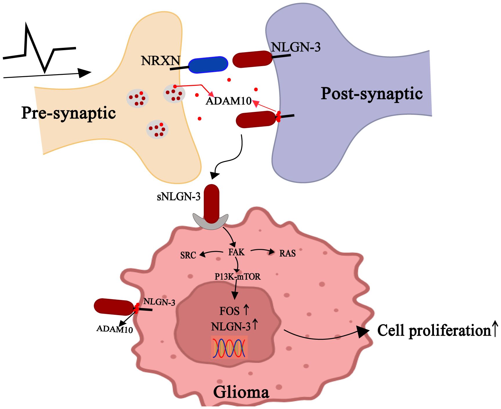 Figure 4. Gliomas exploit paracrine signals of neural plasticity to promote self-development. Neurons release ADAM10 from synaptic vesicles in an activity-dependent manner, which cleaves NLGN3 on neuronal or OPC membranes to shed s-NLGN3. Glioma cells competitively combine s-NLGN3 to activate multiple oncogenic pathways, including PI3K-mTOR, SRC kinase, and the SHC-RAS-RAF-MEK-ERK cascade. Concurrently, ADAM10-mediated cleavage sheds s-NLGN3 from glioma cell membranes, establishing autocrine positive feedback.