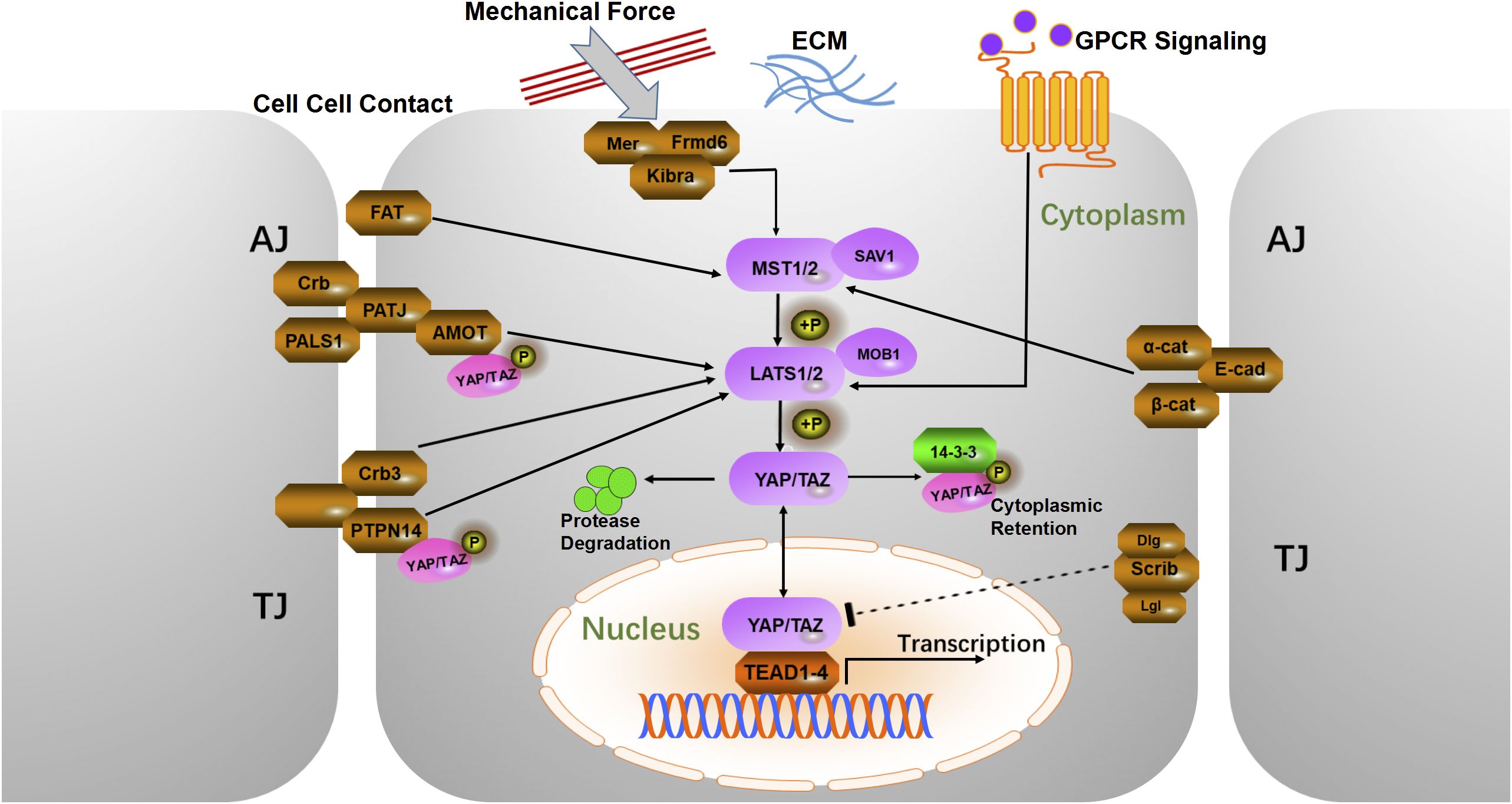Figure 1. Schematic diagram of the mammalian Hippo pathway. The cells are shown with a gray outline, and the nuclei are shown in orange. Upstream regulatory proteins are in brown, intermediate core kinases are in purple, and downstream mediators are in red. Sharp arrows indicate activation, blunt arrows indicate inhibition, and dashed lines indicate unclear mechanisms. AJ, Adherens Junction; TJ, Tight Junction; α-Cat, α-Catenin; β-Cat, β-Catenin; E-cad, E-cadherin; Scrib, Scribble; Lgl, Lethal giant larvae; Dlg, Disks large protein; Amot, Angiomotin; Crb3, Crumbs3; PALS1, Protein associated with lin-7 1; PATJ, Pals1-associated tight junction protein; FAT, FAT atypical cadherin; PTPN14, Protein tyrosine phosphatase 14; Mer, Merlin; Frmd6, Ferm domain containing 6; ECM, Extracellular matrix; GPCR, G-protein coupled receptor.