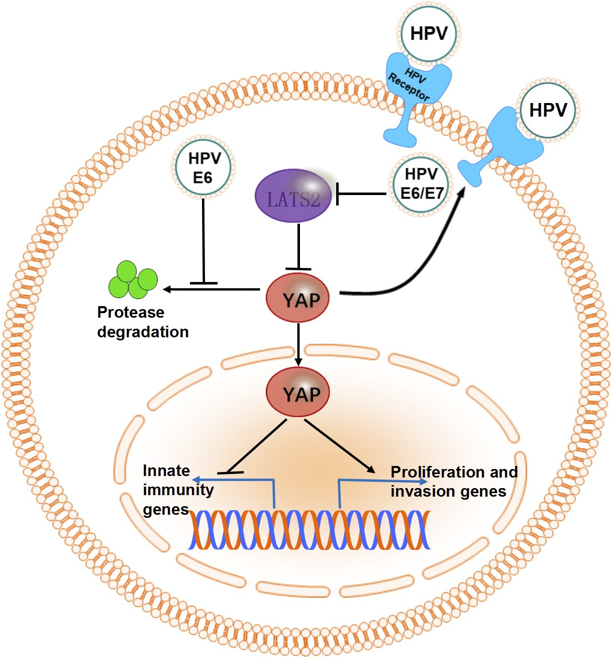 Figure 3. The synergistic effect of HPV and molecules in the Hippo signaling pathway. The overactivated oncogene YAP promotes the expression of HPV receptors and disrupts innate immunity by suppressing the expression of transcription factors. HR-HPV E6/E7 proteins maintain high levels of YAP in CC cells by inhibiting proteasome-mediated degradation or suppressing the expression of LATS2.