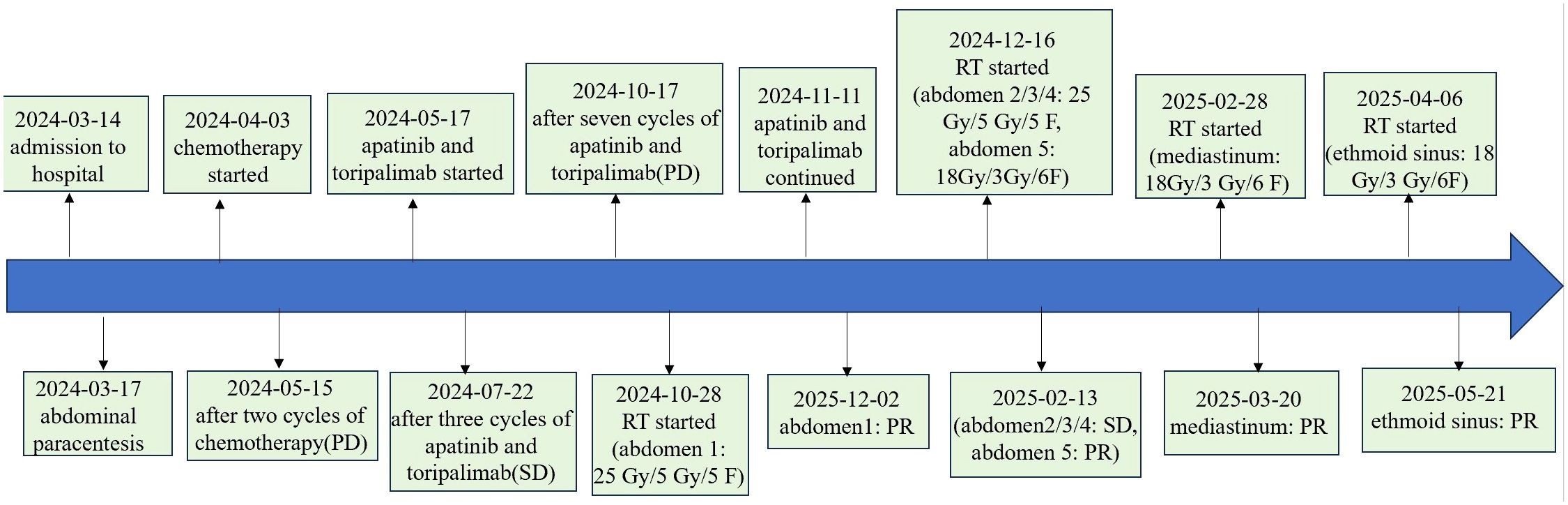 As of May 2025, with over one month elapsed since the final RT session, all irradiated lesions in this patient have maintained PR or SD status. The patient’s Eastern Cooperative Oncology Group (ECOG) performance status was 1, with minimal symptom burden including only mild fatigue. Treatment-related toxicities were limited to grade 1 radiation dermatitis, which showed improvement with symptomatic management. A timeline of the treatment course is provided in Figure 2.