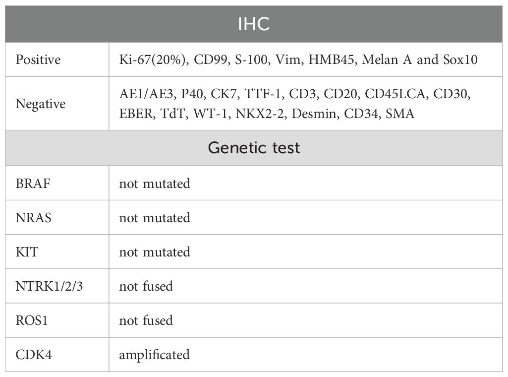 On March 14, 2024, a 60-year-old male presented with abdominal pain. A computed tomography (CT) scan revealed multiple soft-tissue nodules in the abdominopelvic cavity, thoracic cavity, and retroperitoneal space (With a total of six lesions measuring greater than 1 cm, and the largest measuring 9.51 × 4.30 cm), along with enlarged lymph nodes in the anterior mediastinum, bilateral phrenic-diaphragmatic angles, lower esophagus, hepatic hilum, perigastric space, and retroperitoneum. Additionally, inflammatory changes were noted in the left ethmoid sinus. Three days later, the patient underwent abdominal paracentesis. The pathological results showed, microscopically, that round and oval cells were densely arranged in sheets, constituting a tumor lesion. Immunohistochemical (IHC) staining was positive for Ki-67 (20%), CD99, S-100, Vimentin, HMB-45, Melan-A, and SOX10, while being negative for SMA. Genetic testing revealed CDK4 amplification but no mutation in BRAF, NRAS, KIT, and no fusion in NTRK1/2/3 or ROS1(Table 1).