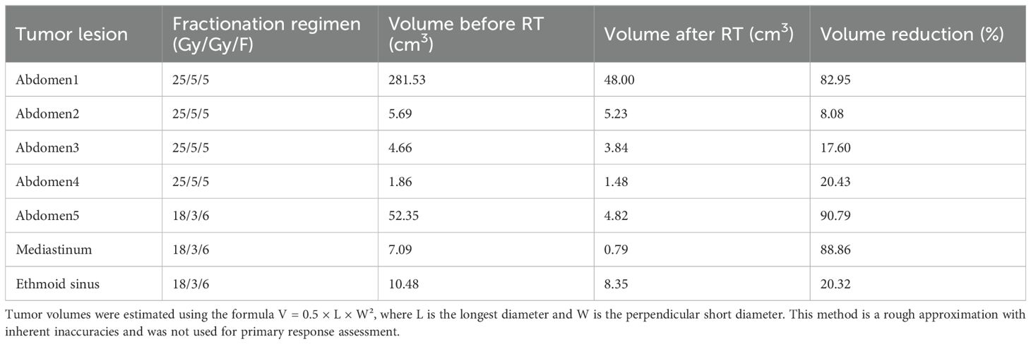 In our report, we observed that the lesion treated with a lower dose (18Gy in 6 fractions) demonstrated superior tumor burden reduction compared to those treated with the higher-dose fractions. This finding appears inconsistent with some literature but highlights a critical point: the radiosensitivity of lesions can be heterogeneous, even within the same patient. Studies have revealed significant heterogeneity in RT responses, which arises from complex interactions between radiation dose and TME (46, 47). Using B78 melanoma and MyC-CaP prostate cancer mouse models, Jagodinsky et al. demonstrated that varying radiation doses can induce distinct biological and treatment outcomes even within a single tumor (48).