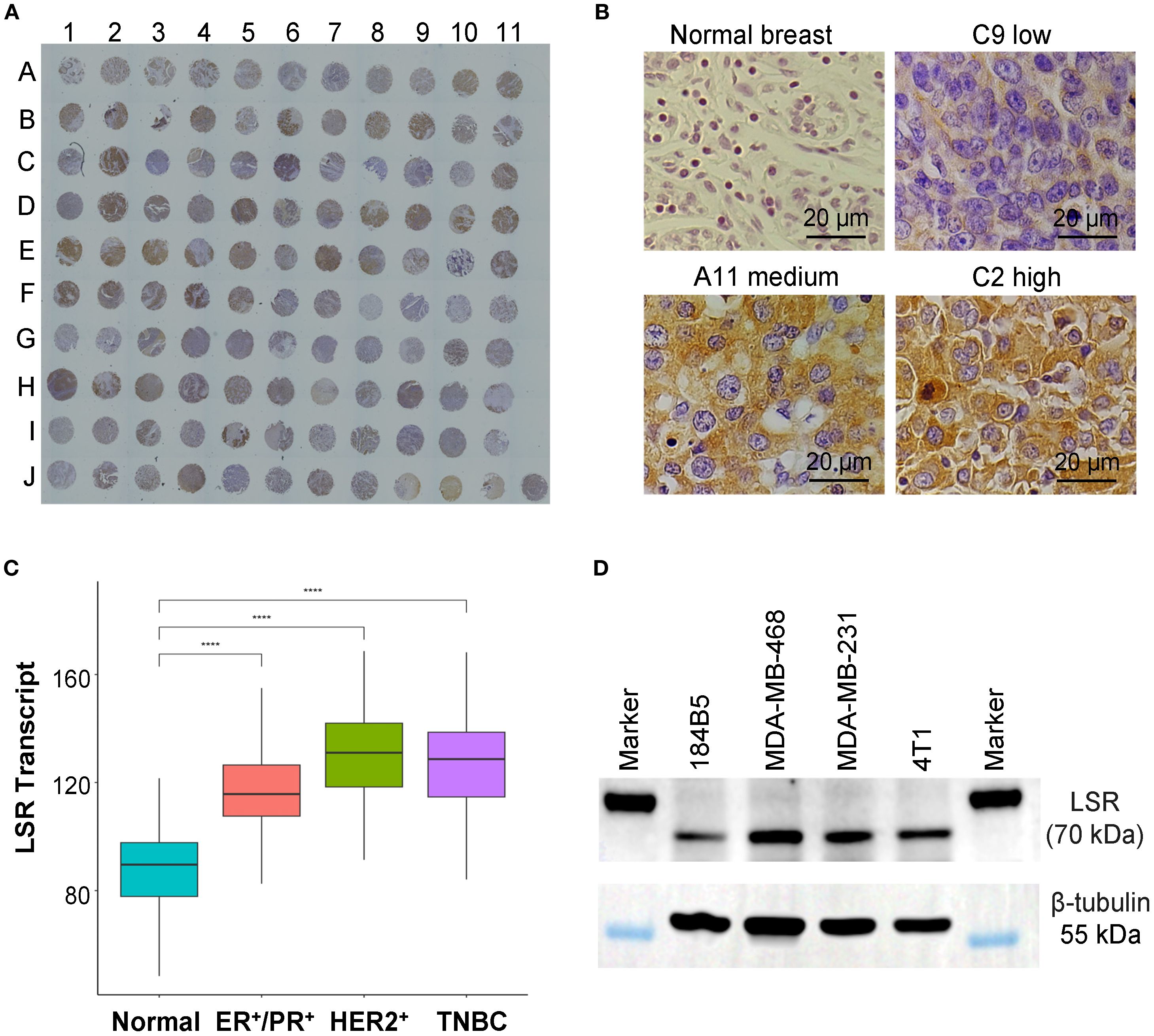 Figure 1. Evaluations of LSR surface receptor in TNBCs. (A) IHC staining of TNBC patient tissue microarray (TMA) with our engineered anti-LSR antibody. n = 110. (B) Representative images of normal breast and TNBC tissues with low, medium and high levels of LSR expression. (C) TCGA transcript analysis of LSR expression of normal breast and breast cancers. (D) Western blotting of TNBC cell lines (MDA-MB-231, MDA-MB-468, 4T1) and normal breast epithelial cell (184B5).