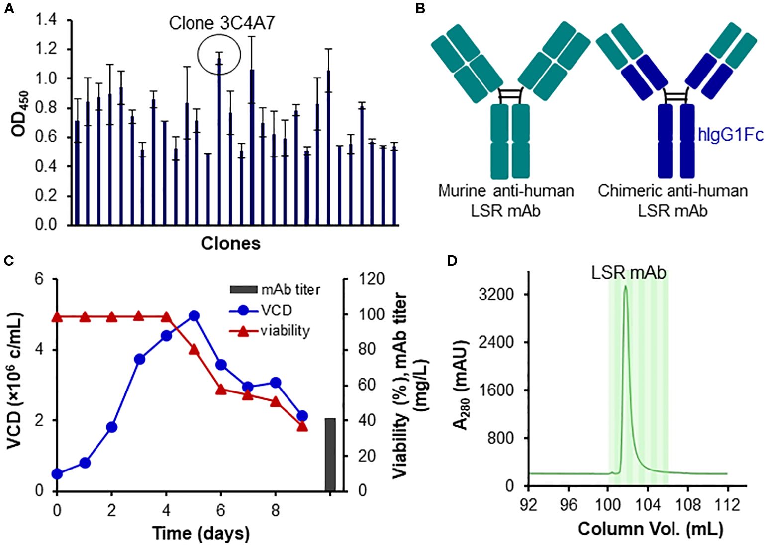 Figure 2. Development, engineering and production of LSR mAb. (A) Clone ranking of murine anti-human LSR mAb. (B) Engineering of LSR mAb by fusing the variable region of the murine anti-human LSR mAb with the constant region of human IgG. (C) Transient production of engineered LSR mAb using HEK293 cells. (D) Purification of engineered LSR mAb using protein A column with liquid chromatography.