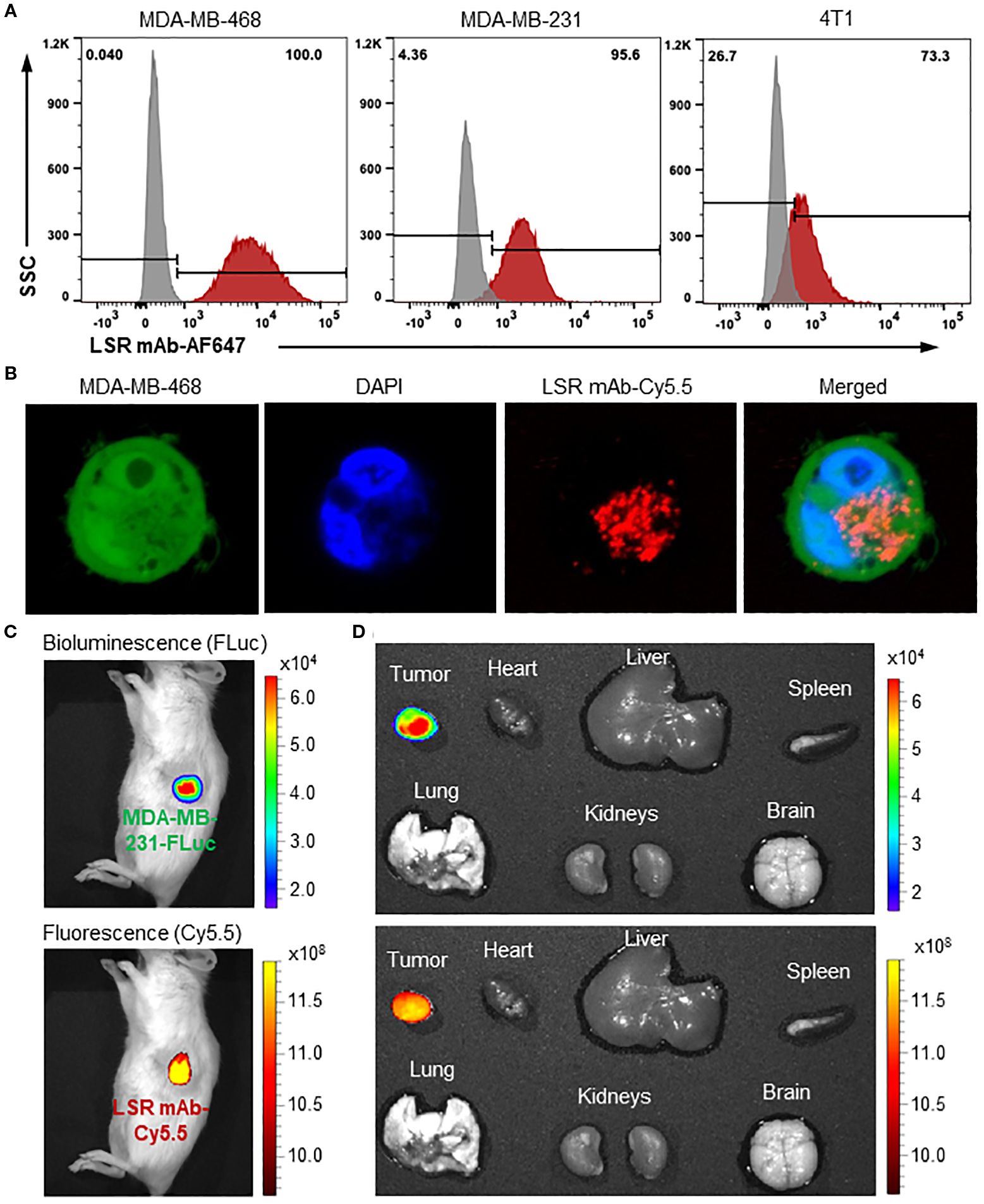Figure 3. Evaluations of TNBC surface binding, internalization and specificity of anti-LSR mAb. (A) Flow cytometry analysis of LSR mAb surface binding to TNBC cells. (B) Confocal microscope showing internalization of mAb (Cy5.5, red) in MDA-MB-468 cells (GFP, green). (C) IVIS imaging of MDA-MB-231 xenografted NSG mice with administration of LSR mAb-Cy5.5. About 80 µg of mAb was injected via tail vein. (D) Ex vivo imaging with IVIS to validate TNBC specificity.