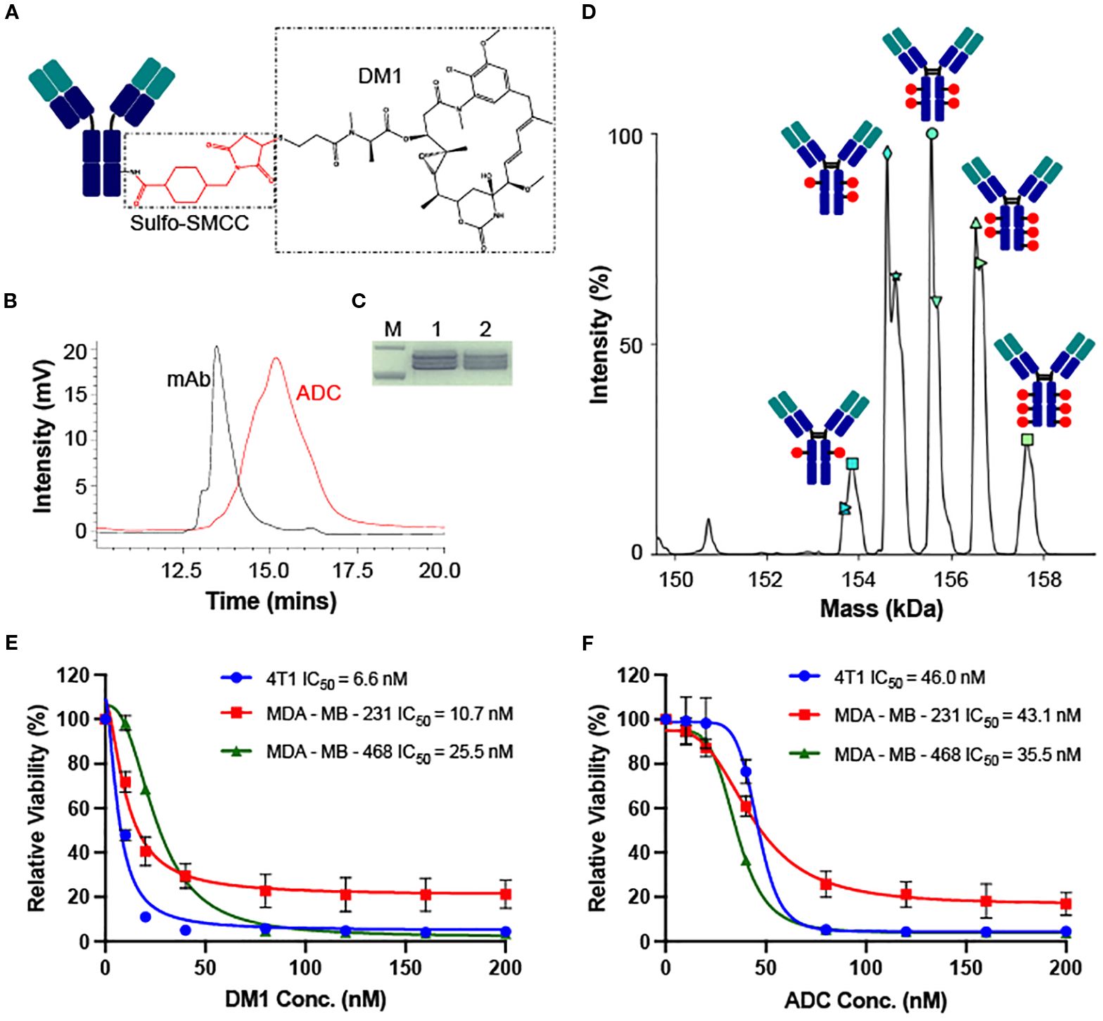 Figure 4. Construction, characterization and in vitro cytotoxicity of LSR ADC. (A) Structure of LSR mAb-DM1. (B) HPLC analysis to confirm conjugation of mAb and drug. (C) SDS-PAGE analysis of ADC integrity. M: Marker; 1: LSR mAb; 2: LSR mAb-DM1. (D) DAR (3.91) analysis of ADC using mass spectrometry. (E) Cytotoxicity of free DM1 in TNBC 4T1, MDA-MB-231 and MDA-MB-468. n = 3. (F) Cytotoxicity of LSR mAb-DM1 in three TNBC cell lines. n = 3.