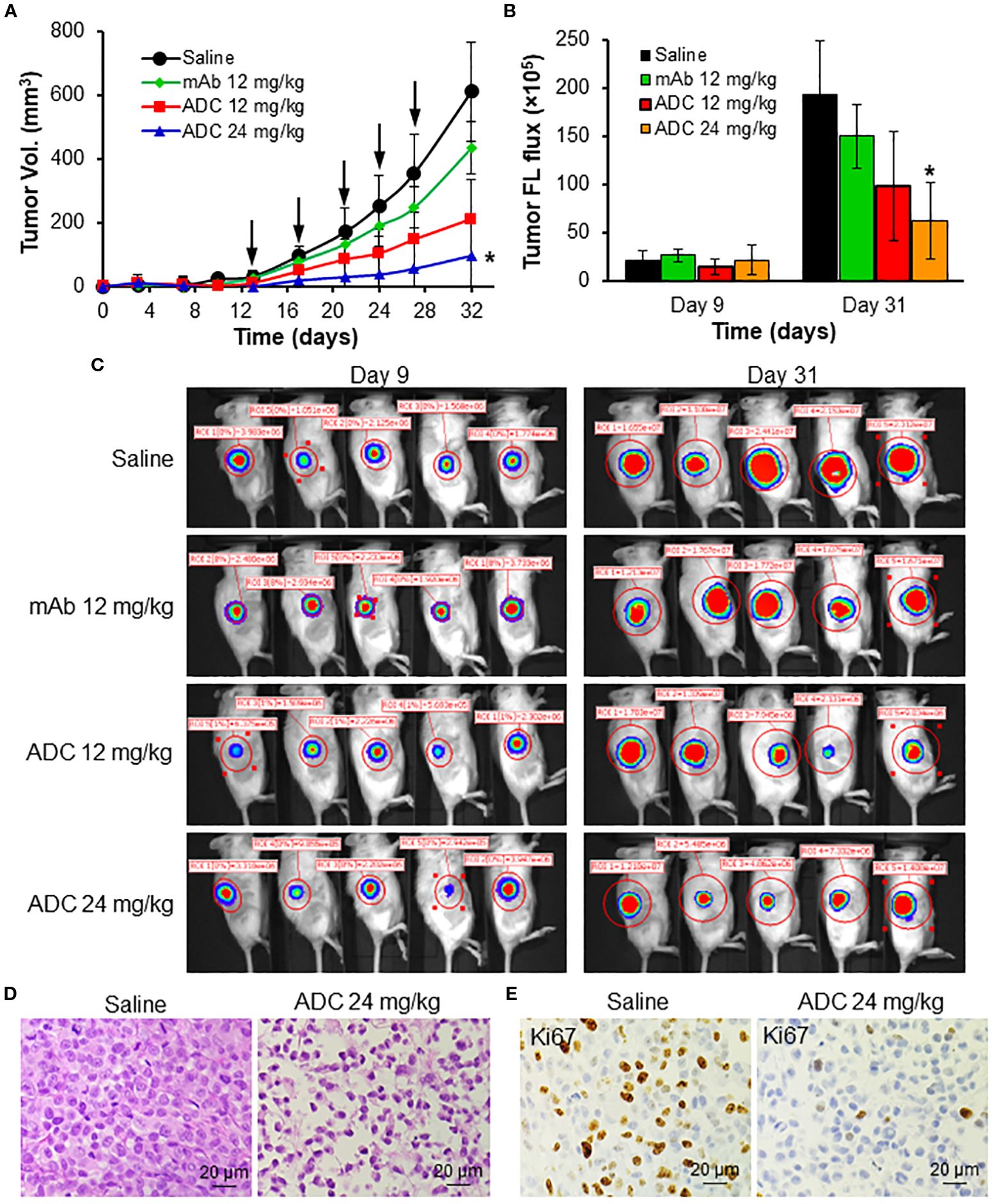 Figure 5. In vivo anti-TNBC efficacy of LSR ADC in MDA-MB-231-FLuc xenograft mouse models. (A) Tumor volume profile as indicated by black arrow. n = 6. Data were presented as mean ± SEM, n = 6. *P<0.05 vs. saline using ANOVA followed by Dunnett’s t-test. (B) Tumor fluorescence flux measured with IVIS. (C) IVIS imaging of mice on Days 9 and 31. (D) H&E staining of harvested tumors. Scale bar equals 20 µm. (E) IHC staining of tumor tissues with Ki67 antibody. Scale bar equals 20 µm.