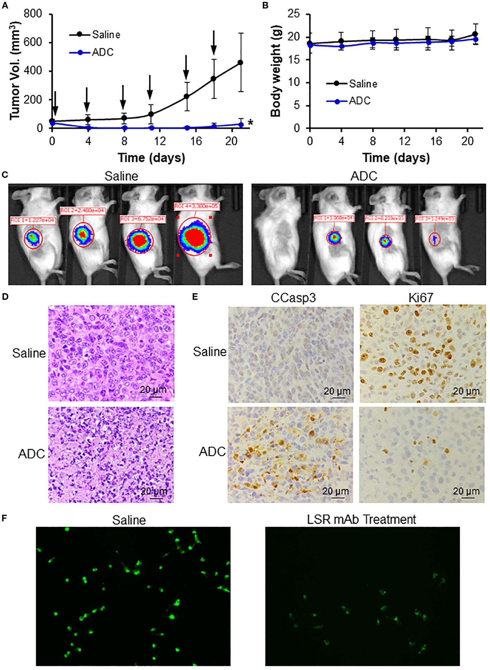 Figure 6. In vivo anti-TNBC efficacy of LSR ADC in 4T1-Fluc xenograft mouse models. (A) Tumor volume profiles. Black arrow indicating i.v. injection. n = 4. Data were presented as mean ± SEM, n = 6. *P<0.05 vs. saline using ANOVA followed by Dunnett’s t-test. (B) Body weight. (C) IVIS imaging of mice on Day 17. (D) H&E staining of tumor tissue indicating apoptosis and cell death of TNBC in treatment group. Scale bar equals 20 µm. (E) IHC staining of tumor tissues with Ki67 (cell proliferation inhibition) and CCasp3 (apoptosis) antibodies. Scale bar equals 20 µm. (F) LSR mAb reduce lipid droplets (green) in MDA-MB-231 cells.