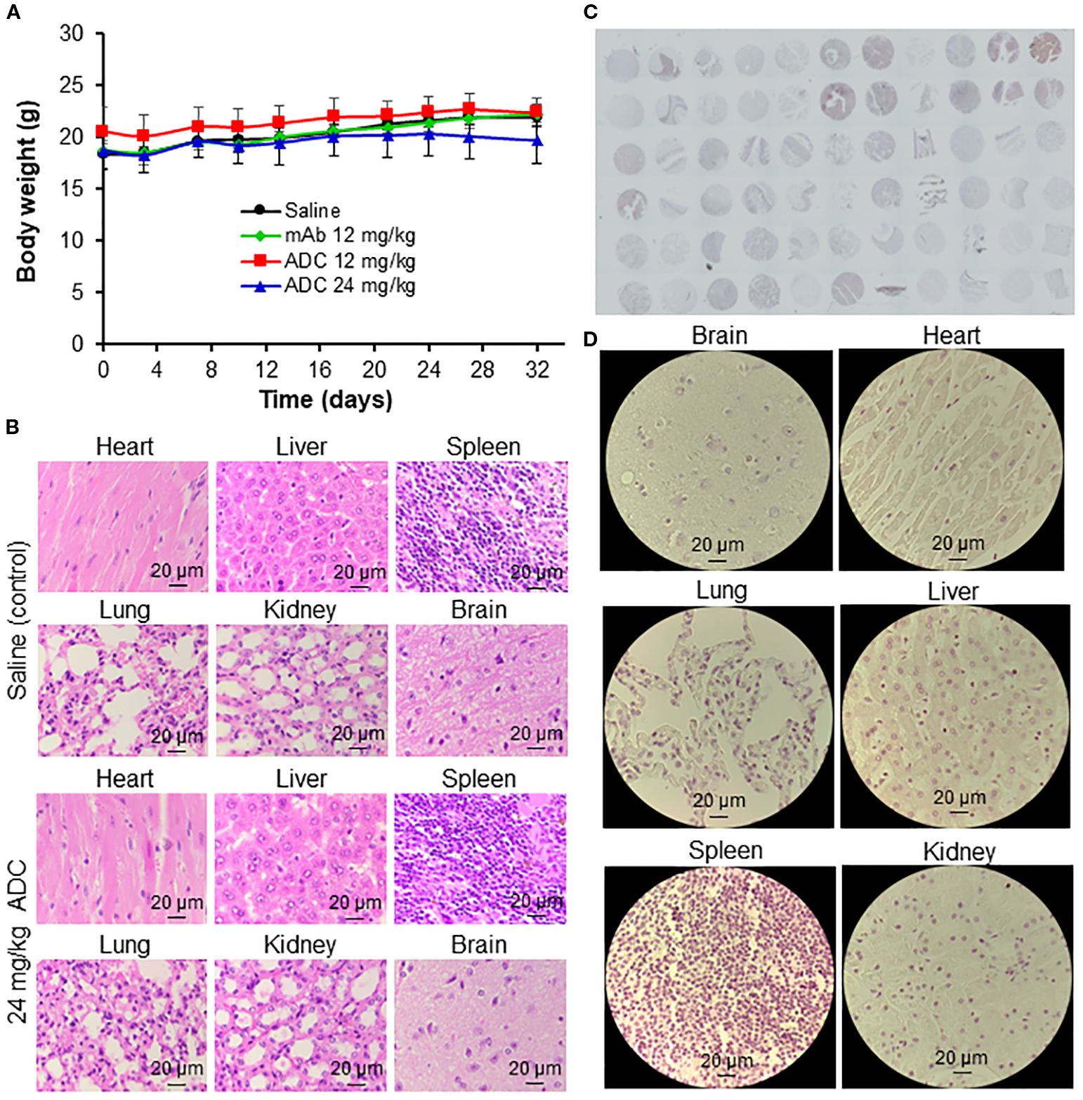 Figure 7. Evaluation of off-target and toxicity of LSR ADC. (A) Body weight of mice. n = 6. (B) H&E staining of major organs (heart, liver, spleen, lung, kidney, and brain). Scale bar equals 20 µm. (C) IHC staining of 33 human normal organs, including cerebrum, cerebellum, peripheral nerve, adrenal gland, thyroid gland, spleen, thymus, bone marrow, lymph node, tonsil, pancreas, liver, esophagus, stomach, small intestine, colon, lung, salivary, pharynx, kidney, bladder, testis, prostate, penis, ovary, uterine tube, breast, endometrium, cervix, cardiac muscle, skeletal muscle, mesothelium and skin. n = 2. (D) Representative IHC images of major organs. Scale bar equals 20 µm.