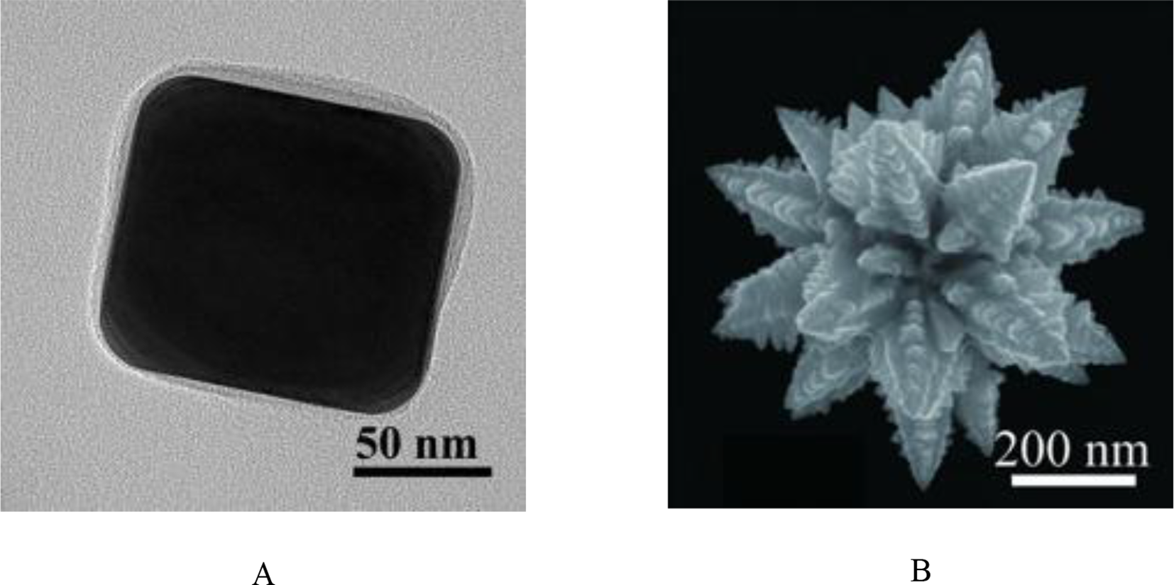 (A) High magnification SEM image of Cube-AuNPs (58); (B) High magnification SEM image of AuNF (55). (copyright permission obtained).