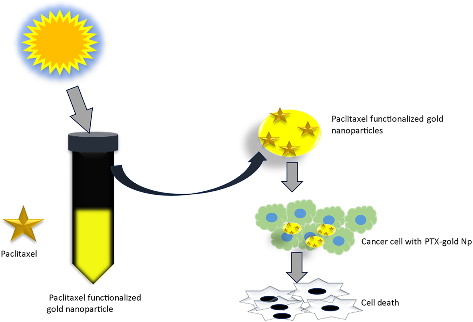 Toxicity and complexity concerns around chemical stabilizers (e.g., 3MPA/3MPS/PVP) drove Kamini et al. to develop a novel PTX delivery platform (70). Their method synthesizes PTX-AuNPs in one step by adding silver ions to PTX/gold ion suspensions under sunlight (Figure 7), where PTX acts as both therapeutic payload and reducing/stabilizing agent (70). This eliminates pre-synthesized AuNPs and exogenous stabilizers, reducing costs while bypassing conventional drug-loading, though the photochemical mechanism requires further study (70).