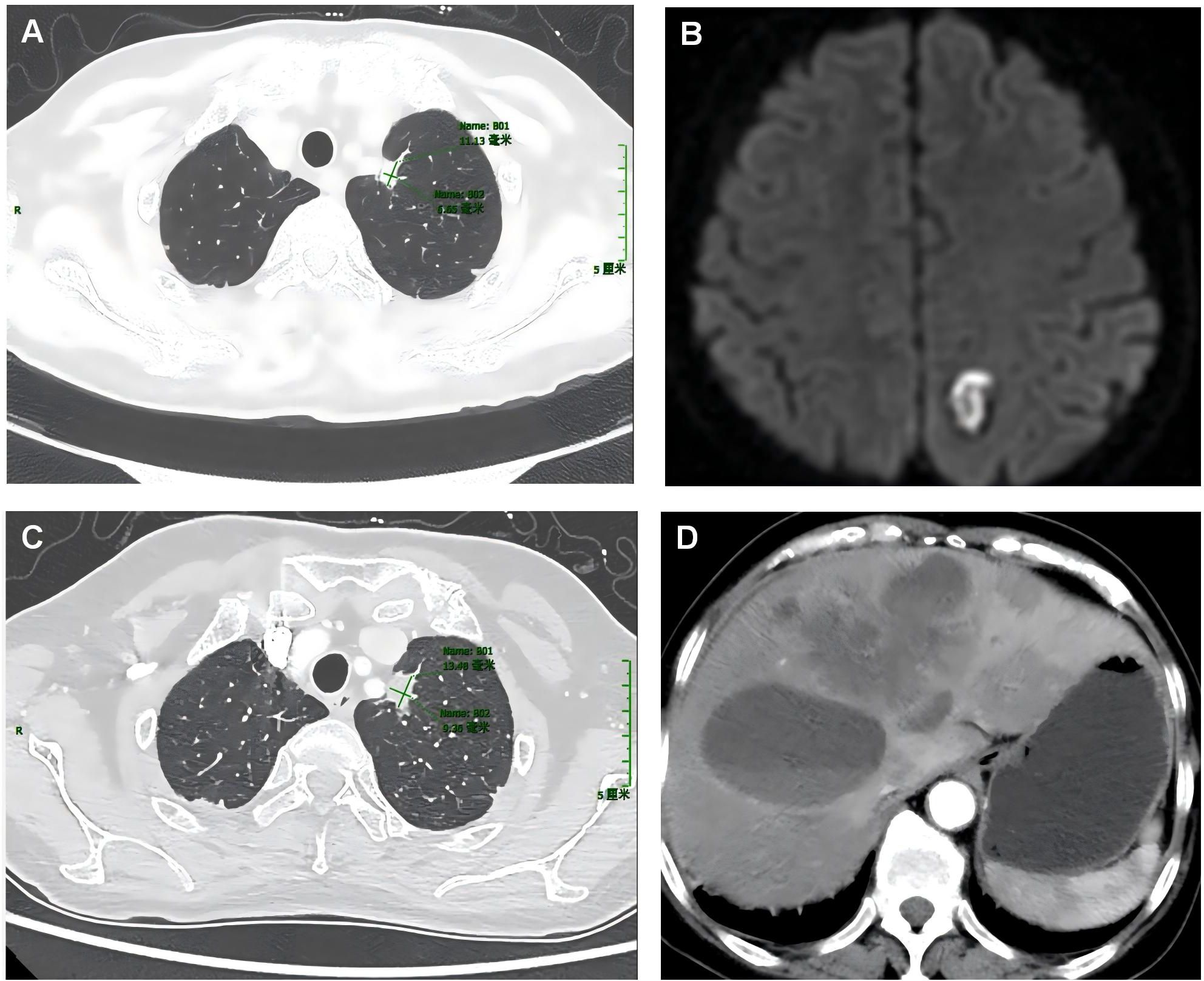 Patient 1, aged 59 years, was diagnosed at our hospital on October 26, 2022, and presented with an unexplained headache, predominantly generalized cranial distending pain. Plain and contrast-enhanced computed tomography (CT) and cranial magnetic resonance imaging (MRI) showed a solid nodule in the left upper lung lobe with mediastinal lymphadenopathy, multiple ground-glass nodules in both lungs, and multiple intracranial space-occupying lesions. The patient was diagnosed with lung cancer accompanied by brain metastasis (Figures 1A, B). No positive signs were found during physical examination. Blood routine test revealed white blood cell count 6.86 × 109/L (normal range: 3.5–9.5 × 109/L), red blood cell count 3.69 × 1012/L (normal range: 3.8–5.1 × 1012/L), hemoglobin 113 g/L (normal range: 115–150 g/L), and platelets 232 × 109/L (normal range: 125–350 × 109/L). Blood biochemical test revealed total protein 56.5 g/L (normal range: 65–85 g/L), albumin 35.4 g/L (normal range: 40–55 g/L), and urea 2.2 mmol/L (normal range: 2.6–7.5 mmol/L); alanine aminotransferase, aspartate aminotransferase, alkaline phosphatase, glucose, and creatinine were all normal. Tumor markers in blood tests were within normal ranges, including alpha-fetoprotein, carcinoembryonic antigen (CEA), carbohydrate antigen 19-9, and carbohydrate antigen 125. Because of intermittent liver pain, an enhanced CT examination of the chest and abdomen was performed in September 2024 (Figures 1C, D), revealing metastases in the liver and left adrenal gland. In November 2024, tumor markers in blood were elevated, including CYFRA21-1 (cytokeratin 19 fragment, 13.86 ng/mL, normal value: 0–3.3 ng/mL), neuron-specific enolase (21.81 ng/mL, normal value: 0–16.3 ng/mL), and CEA (28.81 ng/mL, normal value: 0–5 ng/mL).