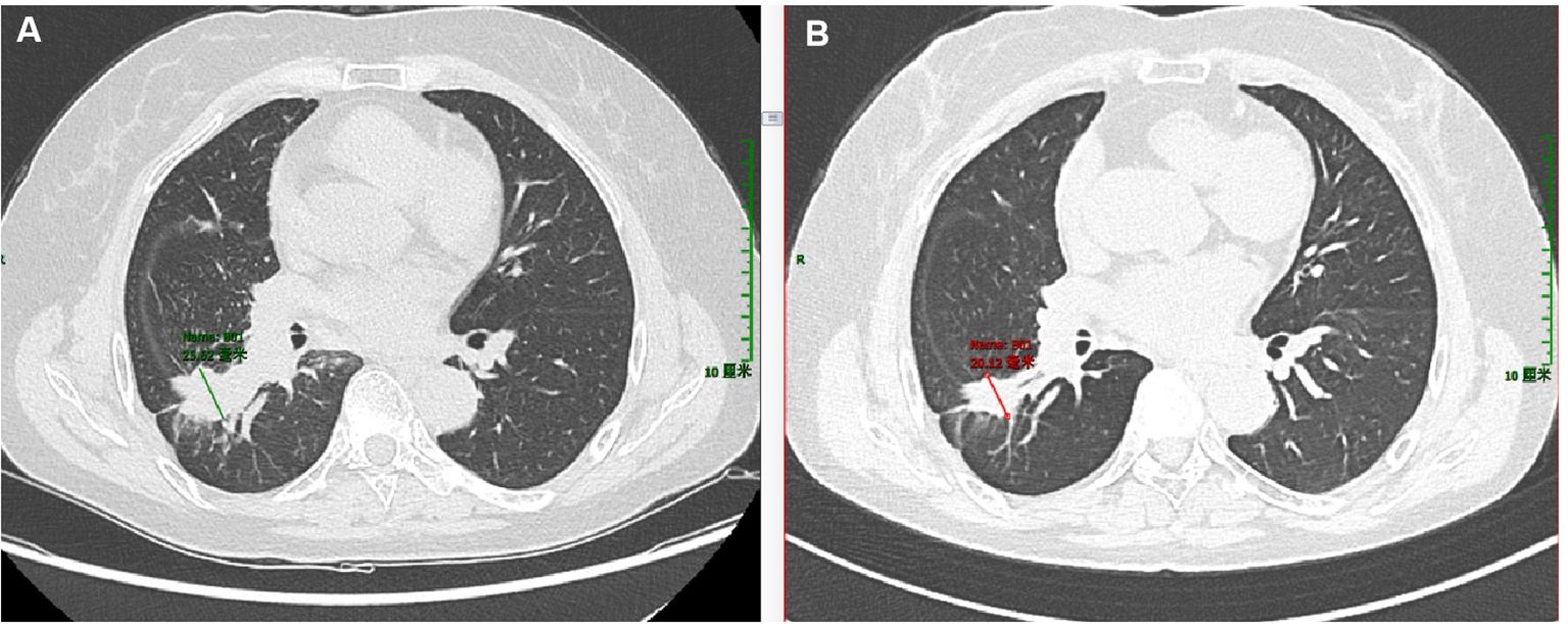 Based on the genetic test results of the lung biopsy tissue, furmonertinib targeted therapy was initiated on May 9, 2024. The patient did not undergo regular follow-up. On November 11, 2024, CT reexamination showed that the lung lesion had improved. The patient was followed up until June 2025 for 13 months, and the condition was well-controlled.