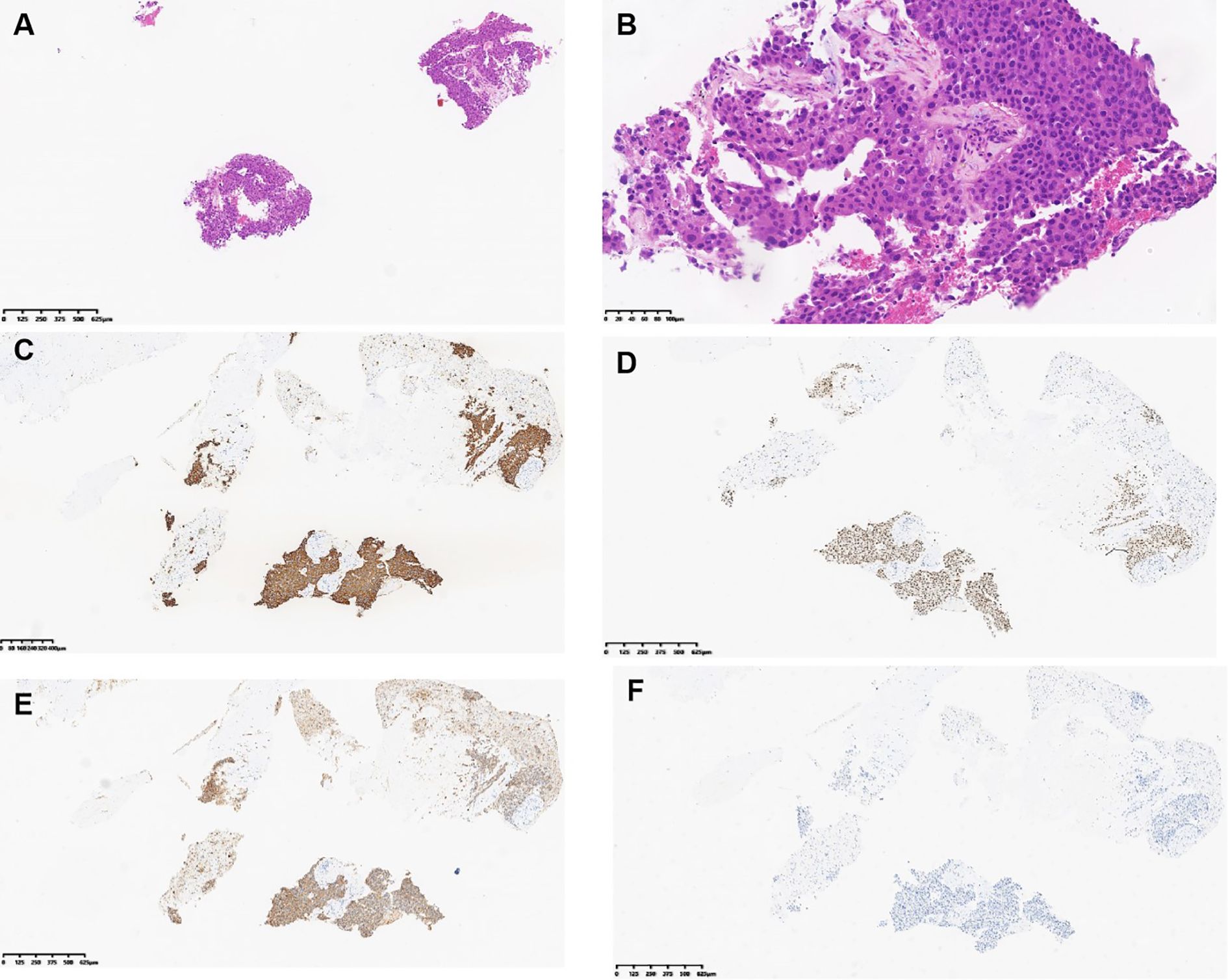 Figure 3. Hematoxylin and eosin (H&E) and immunohistochemical images of the liver lesion biopsy of patient 1. (A) H&E staining, magnification ×40. (B) H&E staining, magnification ×200. (C) Tumor expressed CK7. (D) Tumor expressed TTF-1. (E) Tumor expressed Napsin (A). (F) Tumor did not express HepPar-1. (C–F) Magnification ×40.