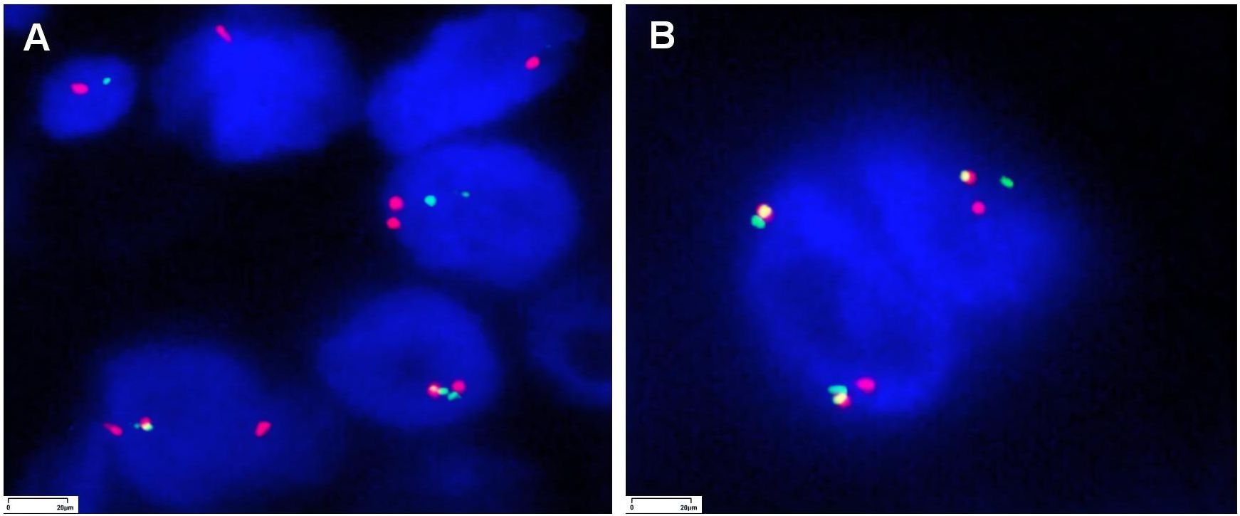 Figure 4. Fluorescence in situ hybridization (FISH) images for NTRK testing of the liver tumor in patient 1 and lung tumor in patient 2 (magnification ×1,000).
