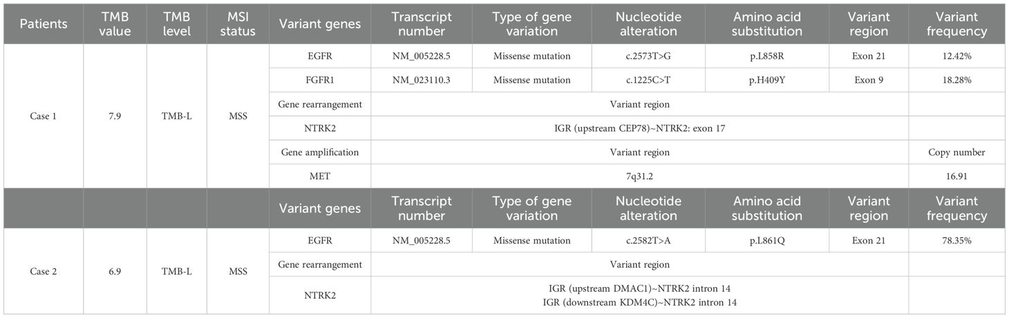Results: Both patients were women aged 57 and 66 years. The two cases were diagnosed as invasive lung adenocarcinoma, and immunohistochemical staining showed that all tumor cells expressed CK7, Napsin A, TTF-1, and PD-L1. In Case 1, an EGFR mutation in the primary lung lesion, coexistence of NTRK2 fusion and EGFR mutation in liver metastases, and concurrent MET gene amplification and FGFR1 gene mutation were observed. In Case 2, the coexistence of NTRK2 fusion and EGFR mutation was detected in the primary lung lesion. The Tumor Mutation Burden (TMB) and microsatellite status were classified as TMB-L and MicroSatellite Stable (MSS), respectively, in both cases. Case 1 received osimertinib combined with savolitinib, had 33 months of follow-up, and achieved a partial response. Case 2 received furmonertinib and achieved a complete response.