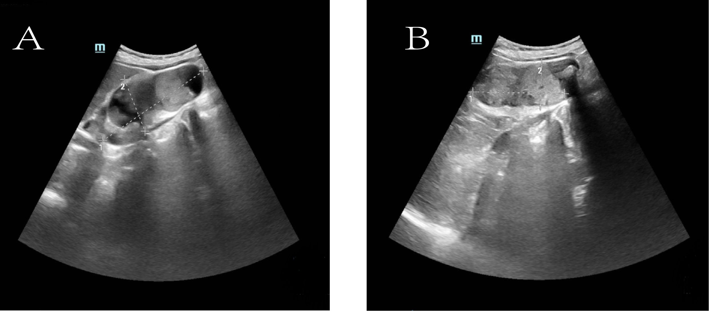 Figure 1. Ultrasonographic images of the gallbladder. (A) The gallbladder is enlarged (measuring approximately 9.7 × 4.2 cm) with a non-thickened wall (delineated by dashed line). Multiple hyperechoic foci are observed within the lumen, accompanied by dense posterior acoustic shadowing. (B) A medium-echoic mass, measuring approximately 7.0 × 3.1 cm, is visible within the gallbladder lumen (outlined by dashed line).
