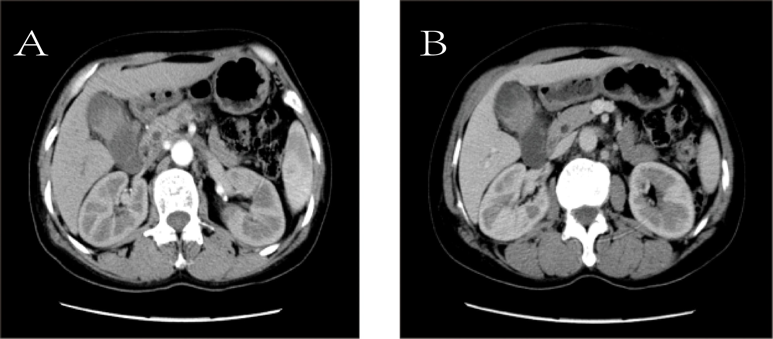 Figure 2. Contrast-enhanced computed tomography (CT). (A) Arterial phase image shows the mass (white arrow). (B) Venous phase image of the same mass (white arrow).