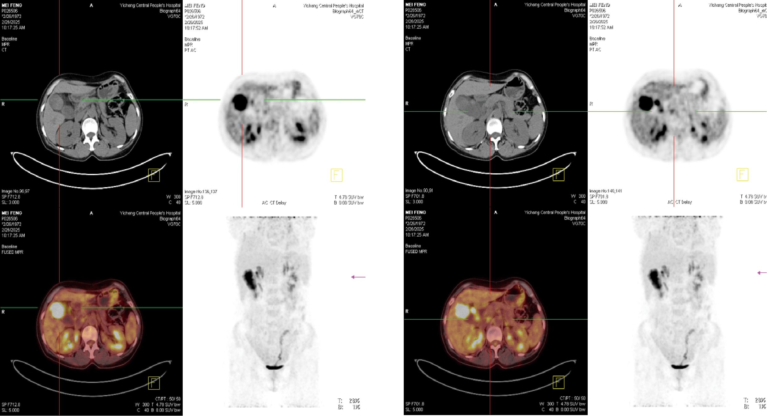 At the time of this report, the patient had completed 6 months of follow-up with good general condition. A PET-CT scan on September 8, 2025 showed no recurrence or metastasis. Initially, the patient experienced significant psychological distress due to the coexistence of two malignancies, but both physical and mental status improved markedly following successful surgery and the “tailor-made” comprehensive treatment plan, with satisfactory outcomes reported.