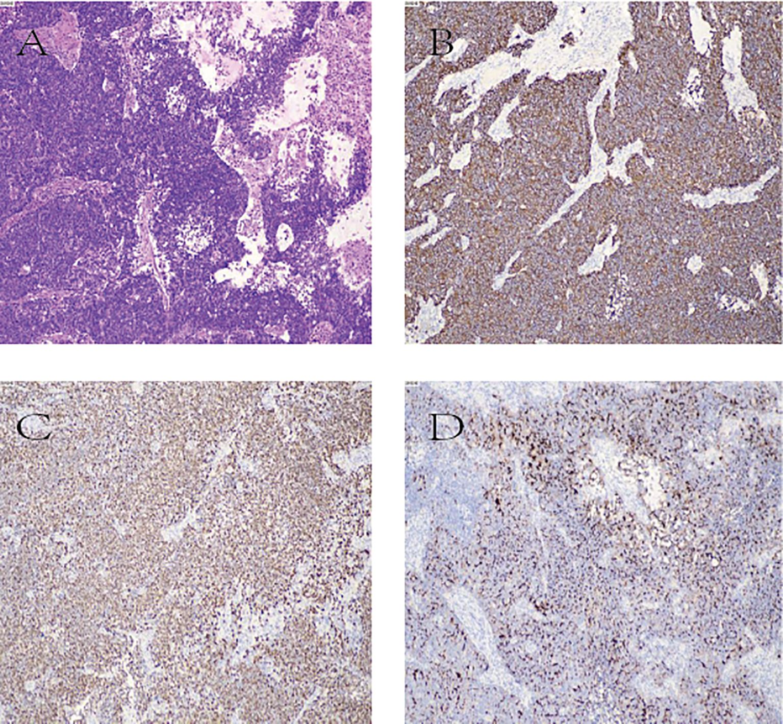 Figure 4. (A) Hematoxylin and eosin (H&E) staining image; (B–D) Immunohistochemical staining images. (B): CK8 positive (CK8+); (C) INSM1 positive (INSM1+); (D) MUC1 positive (MUC1+).
