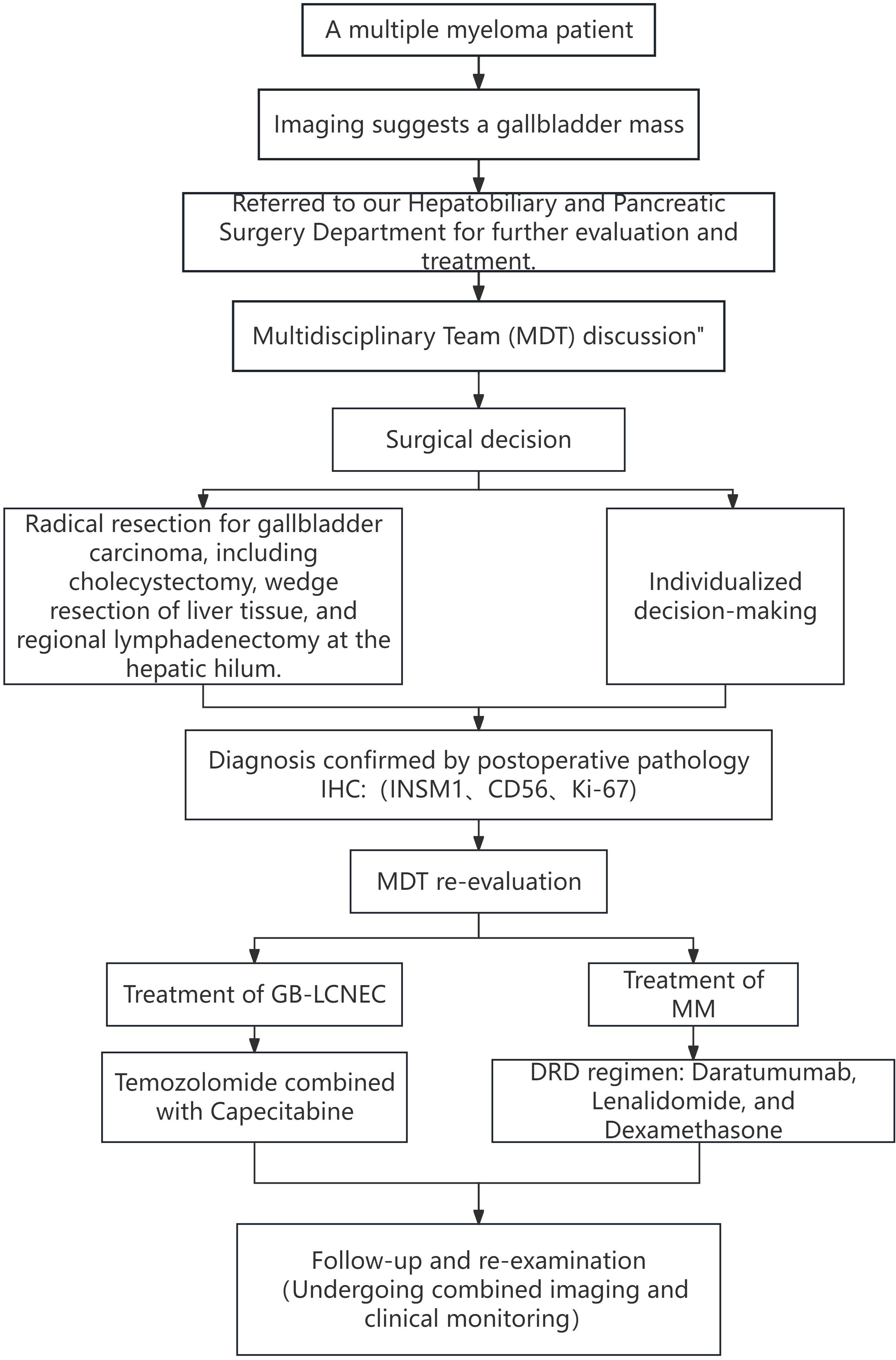 The patient recovered well postoperatively. Considering the dual malignancies, the MDT reconvened to formulate a comprehensive follow-up treatment plan. For GB-LCNEC, the standard EP regimen (cisplatin + etoposide) was considered inappropriate due to the high likelihood of intolerable bone marrow suppression and infection risks. After extensive MDT discussions, the patient was started on an oral chemotherapy regimen combining temozolomide with capecitabine (CAPTEM), which has relatively mild toxicity and is more suitable for patients with hematologic comorbidities. For multiple myeloma management, the patient had initially received the DVD regimen (daratumumab, bortezomib, dexamethasone) preoperatively and achieved partial response (PR). Subsequently, treatment was switched to DRD (daratumumab, lenalidomide, dexamethasone) to balance efficacy with tolerability. The detailed diagnostic and therapeutic workflow is shown in Figure 5.