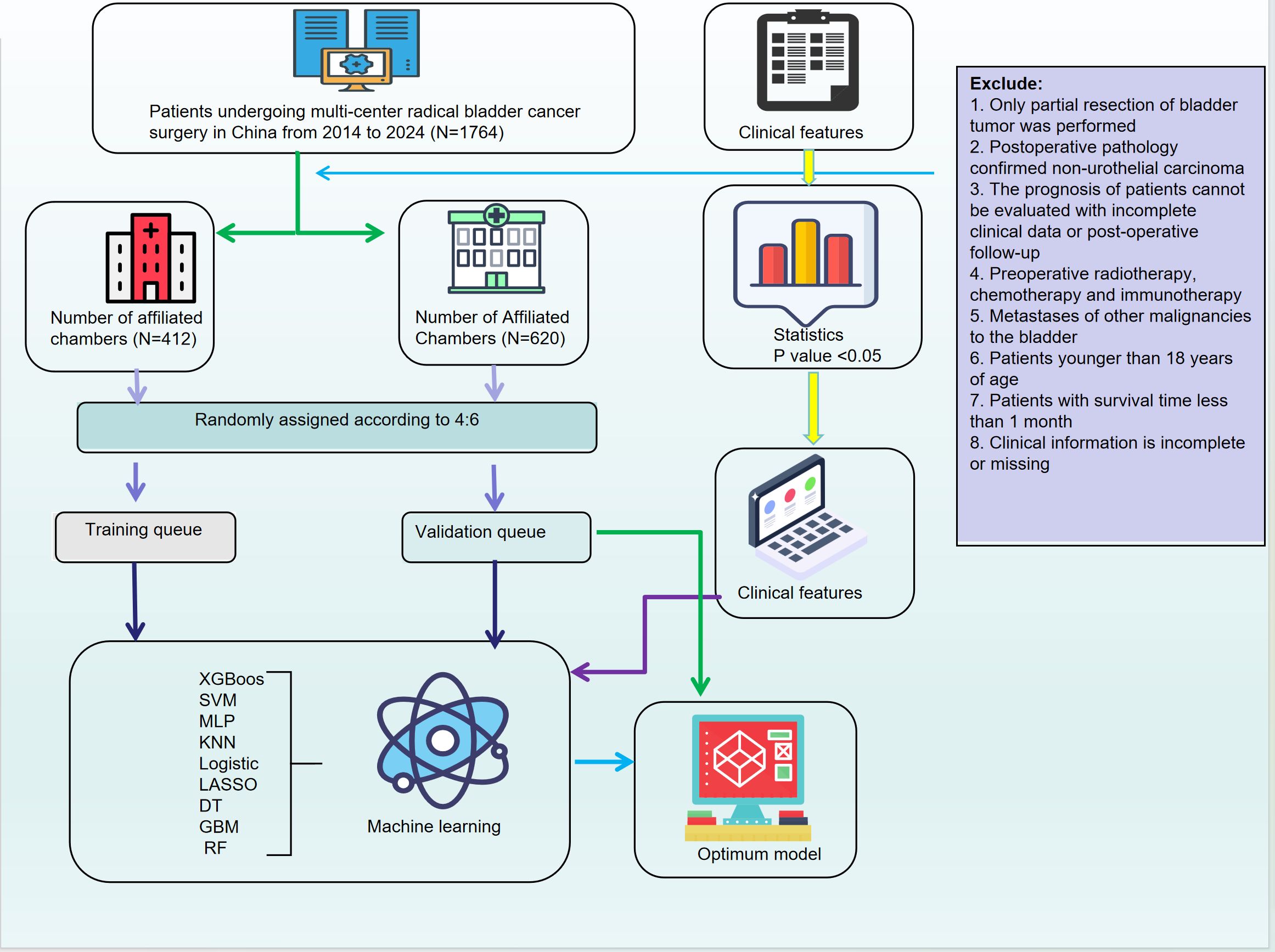We retrospectively collected clinical data from 1,764 bladder cancer patients who underwent radical cystectomy (RC) between 2014 and 2024 at the First and Second Affiliated Hospitals of Kunming Medical University. The dataset included demographic characteristics (age, sex, ethnicity, smoking status, alcohol consumption), medical history, tumor morphology, and pathological features (e.g., Uroplakin-III, PD-L1, HER2, perineural invasion). In addition to these features, pathological staging, tumor grade, and surgical margin status were also integral to the dataset. Patients were categorized based on pathological stage, specifically focusing on stages T3 and higher, with particular attention to surgical margin involvement and evidence of vascular or perineural invasion. These factors are critical in determining the need for adjuvant chemotherapy following radical cystectomy, as they significantly affect prognosis and the risk of recurrence.Inclusion criteria were: age ≥18 years, bladder cancer diagnosis confirmed by WHO classification, availability of complete clinical data, and no prior treatment with radiotherapy, chemotherapy, or immunotherapy before surgery. Exclusion criteria were: partial resection, non-urothelial carcinoma, incomplete data, or prior treatments. This study was approved by the Ethics Committees of both participating hospitals, and informed consent was obtained from all patients. To address missing data, variables with less than 20% missingness were imputed using the K-Nearest Neighbors (KNN) method, while those with more than 20% missingness were excluded.