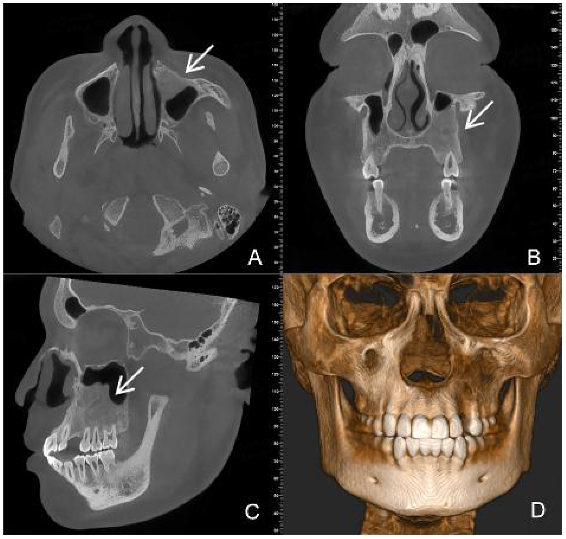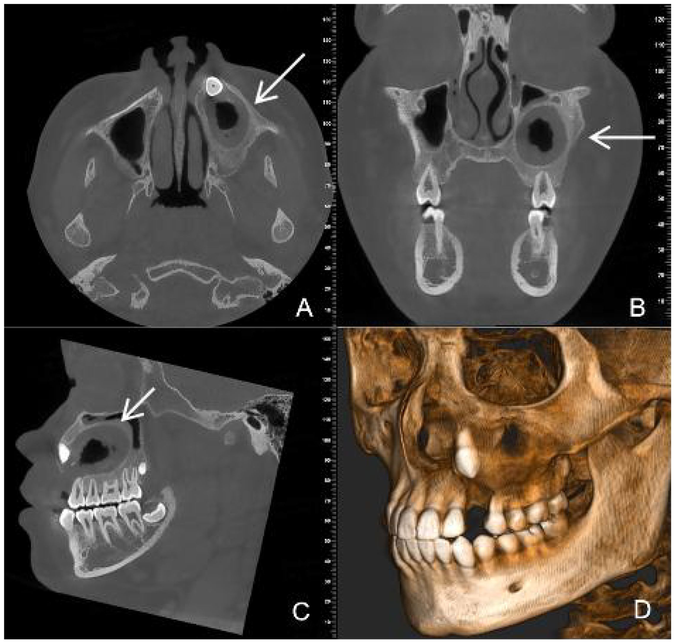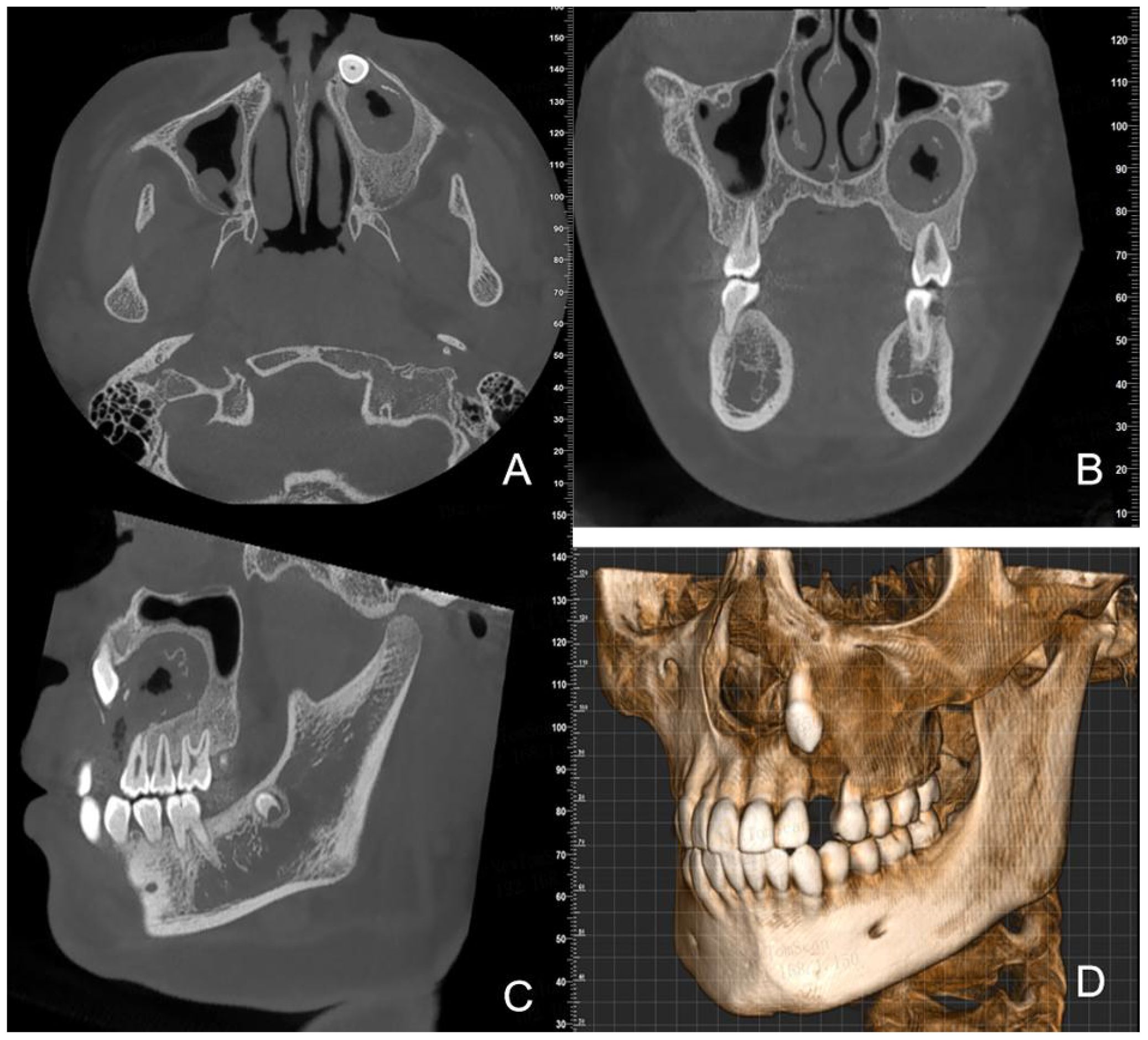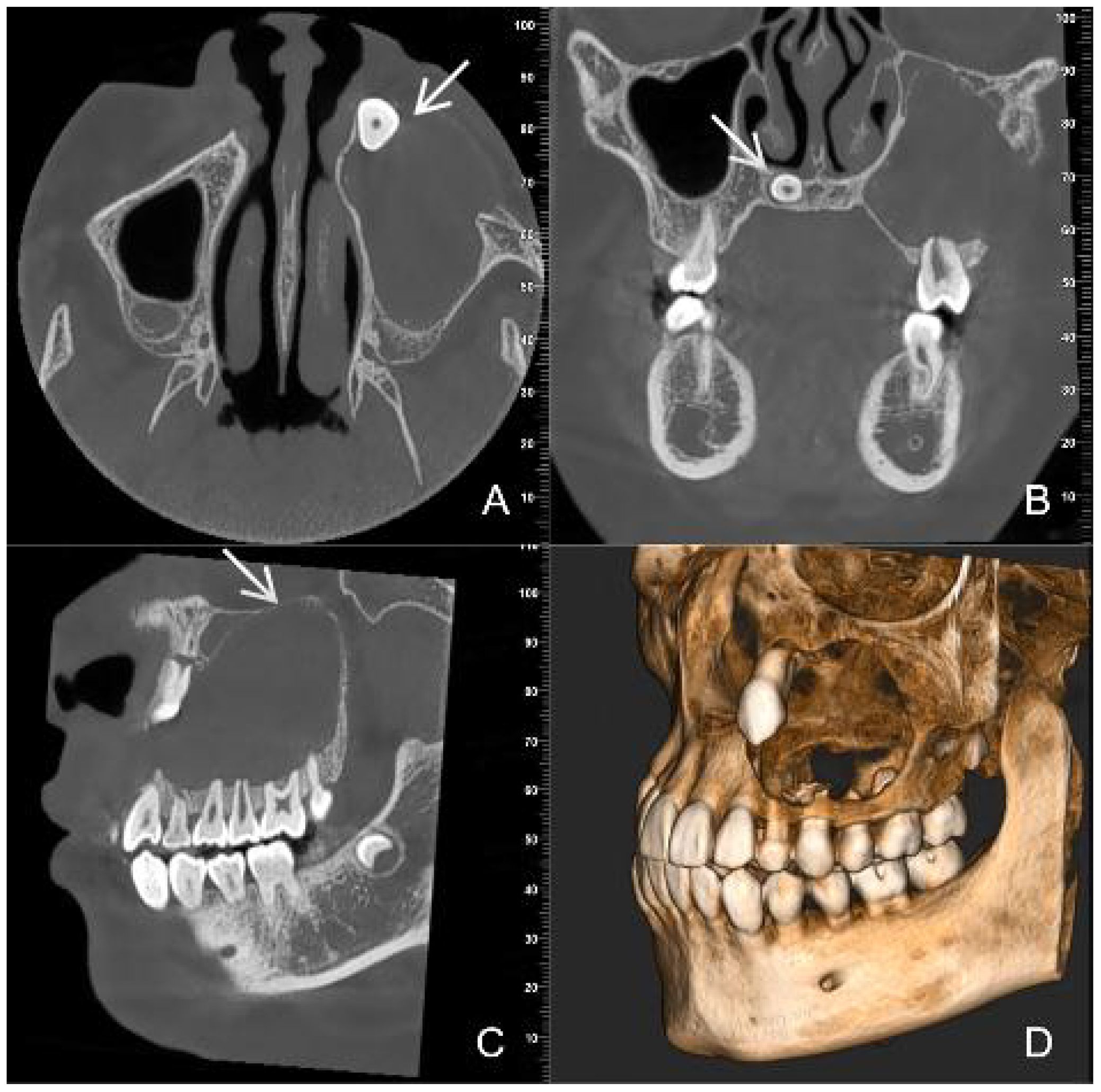 Figure 1. Preoperative CBCT images (A) (axial view) (B) (coronal view) (C) (sagittal view) (D) (three-dimensional reconstruction) show a large, low- density cyst with clear boundaries [images (C) white arrow]. An impacted tooth 23 [images (A) white arrow] with large irregular high-density masses is present within the lesion. A supernumerary tooth [images (B) white arrow] is observed in the maxillary palate slightly to the right of the midline.