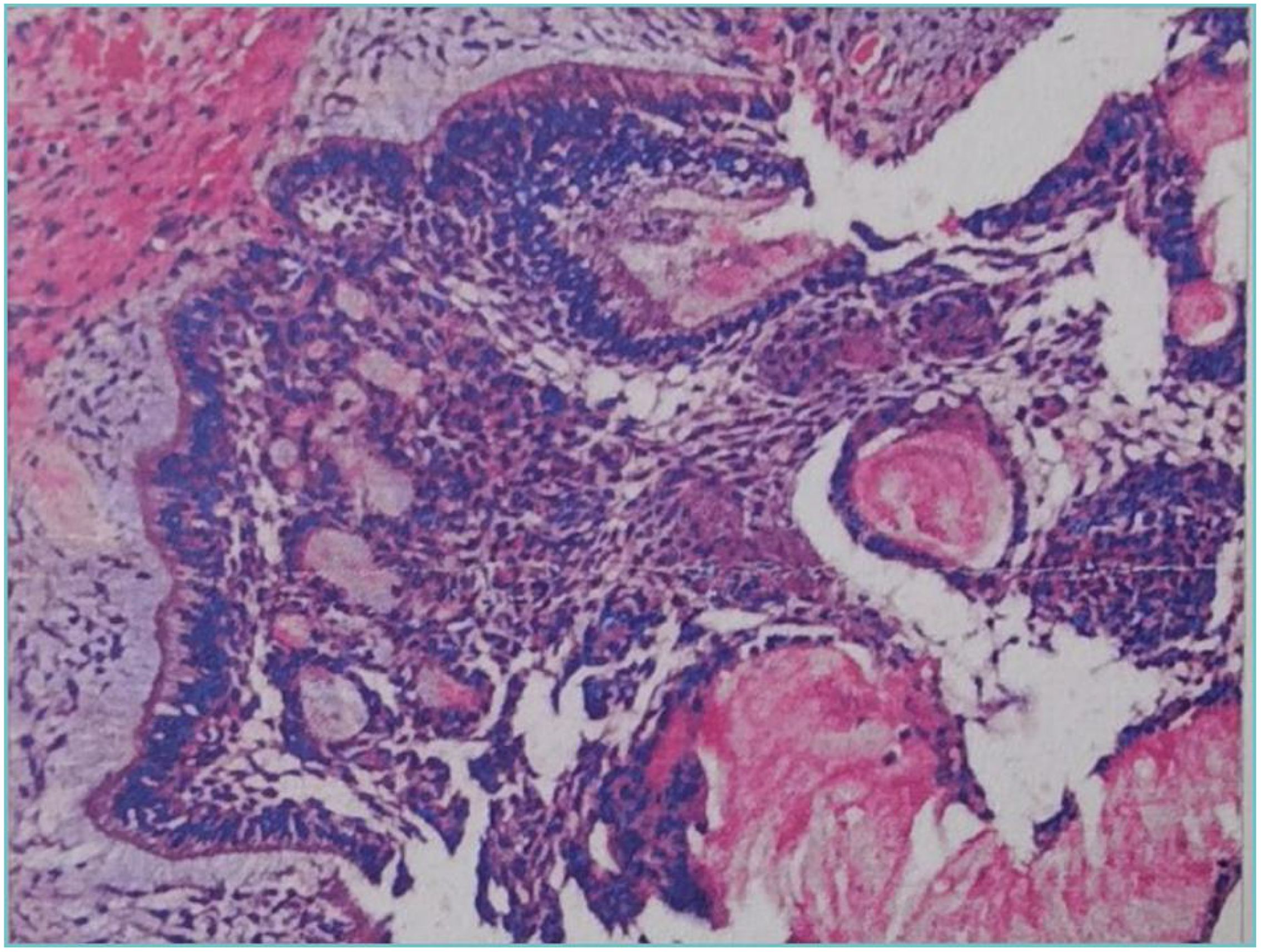 Figure 2. Postoperative pathology of decompressive surgery show tissue containing ameloblastoma-like epithelium and shadow cells.