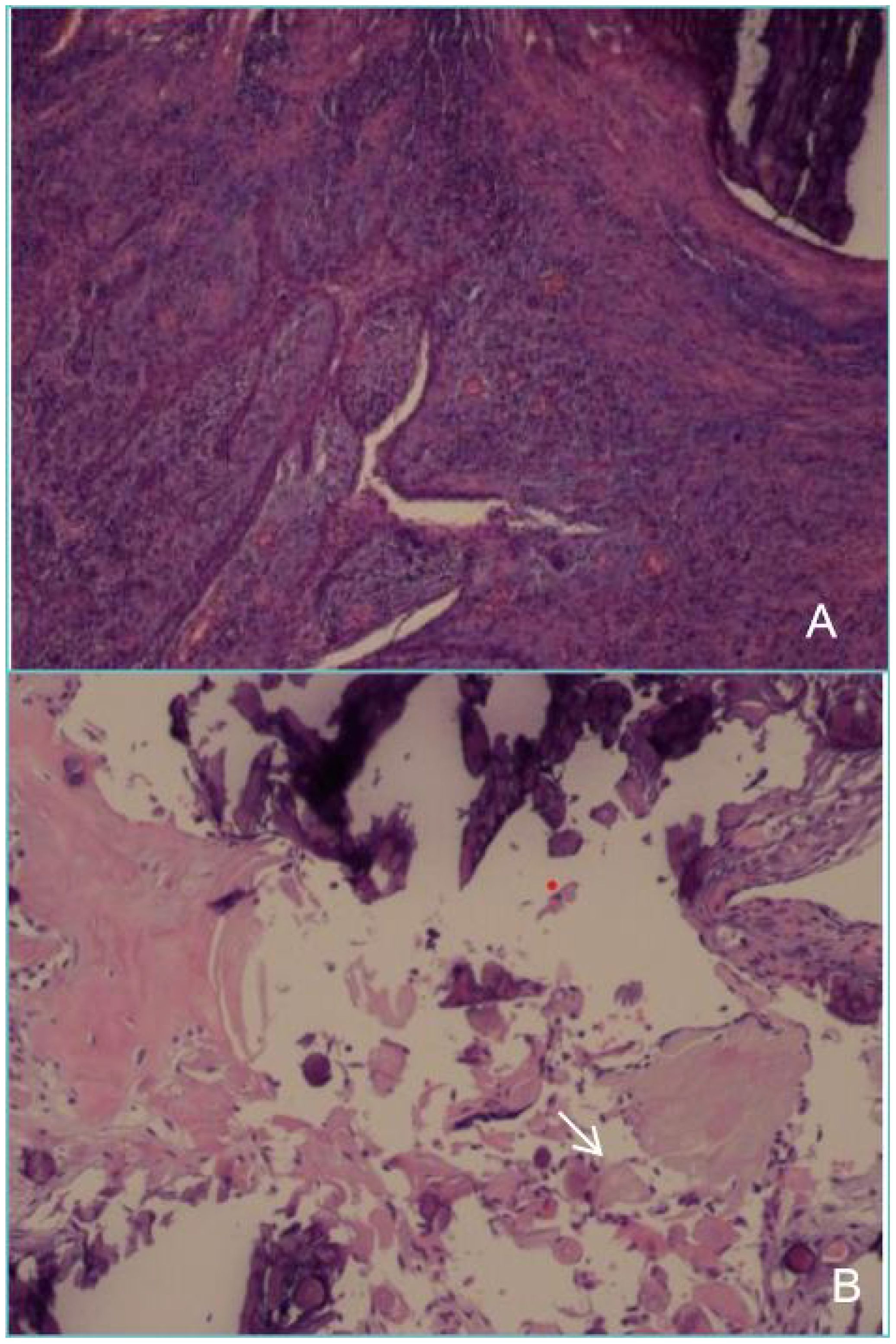 Figure 5. Postoperative pathology of the tumour resection (A) shows that the cyst wall is partly covered with squamous epithelium and partly with glaze, epithelium, with dentin hyperplasia, with extensive calcification. (B) shows shadow cells (white arrow) that are round or oval in shape, with distinct cell outlines. The cytoplasmic and nuclear staining has disappeared, leaving only empty shell-like shadow structures distributed around the calcified material.