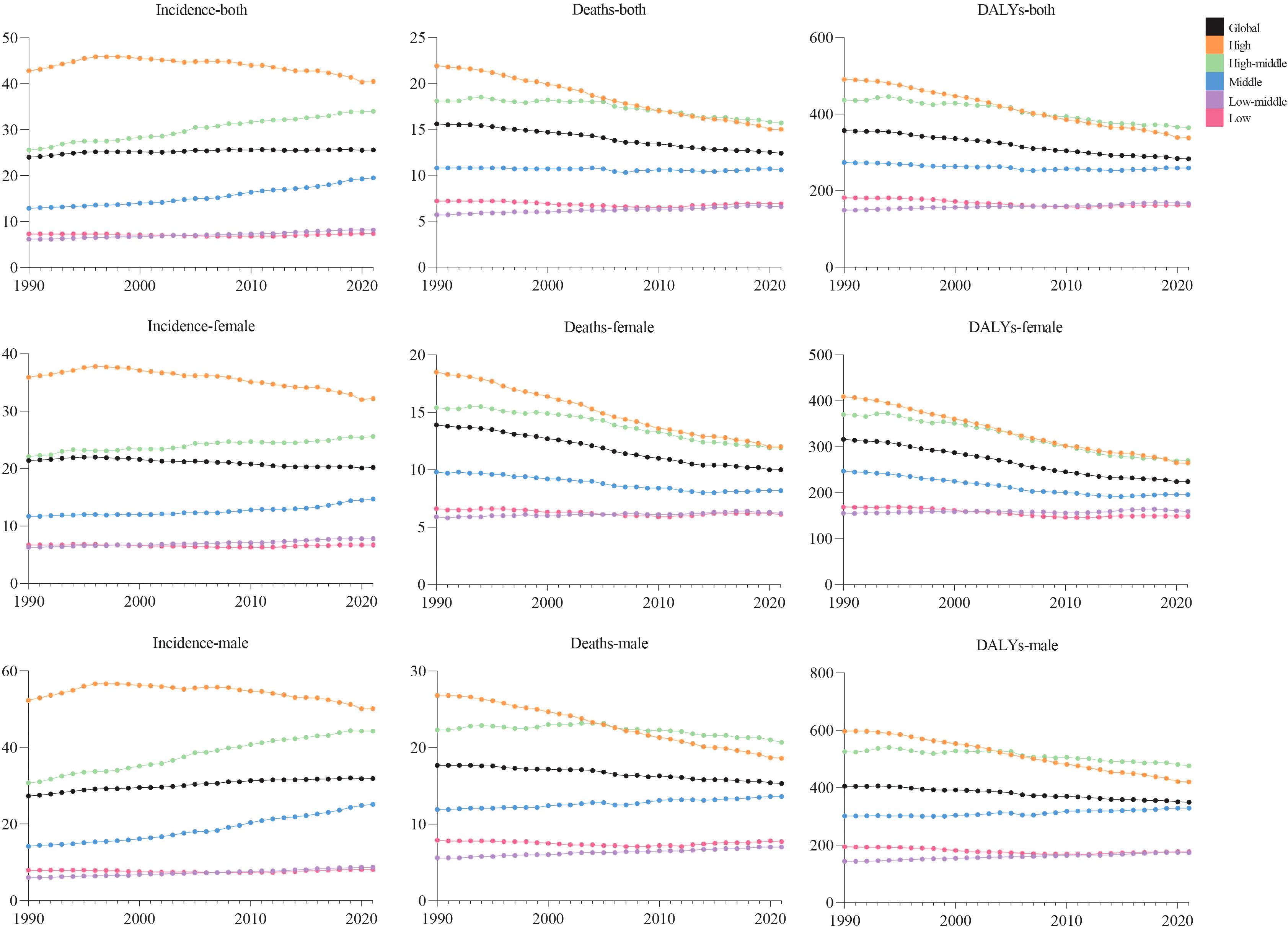 Figure 1. Trends in global incidence, deaths, and DALY rates of colorectal cancer by sex and SDI, from 1990 to 2021.