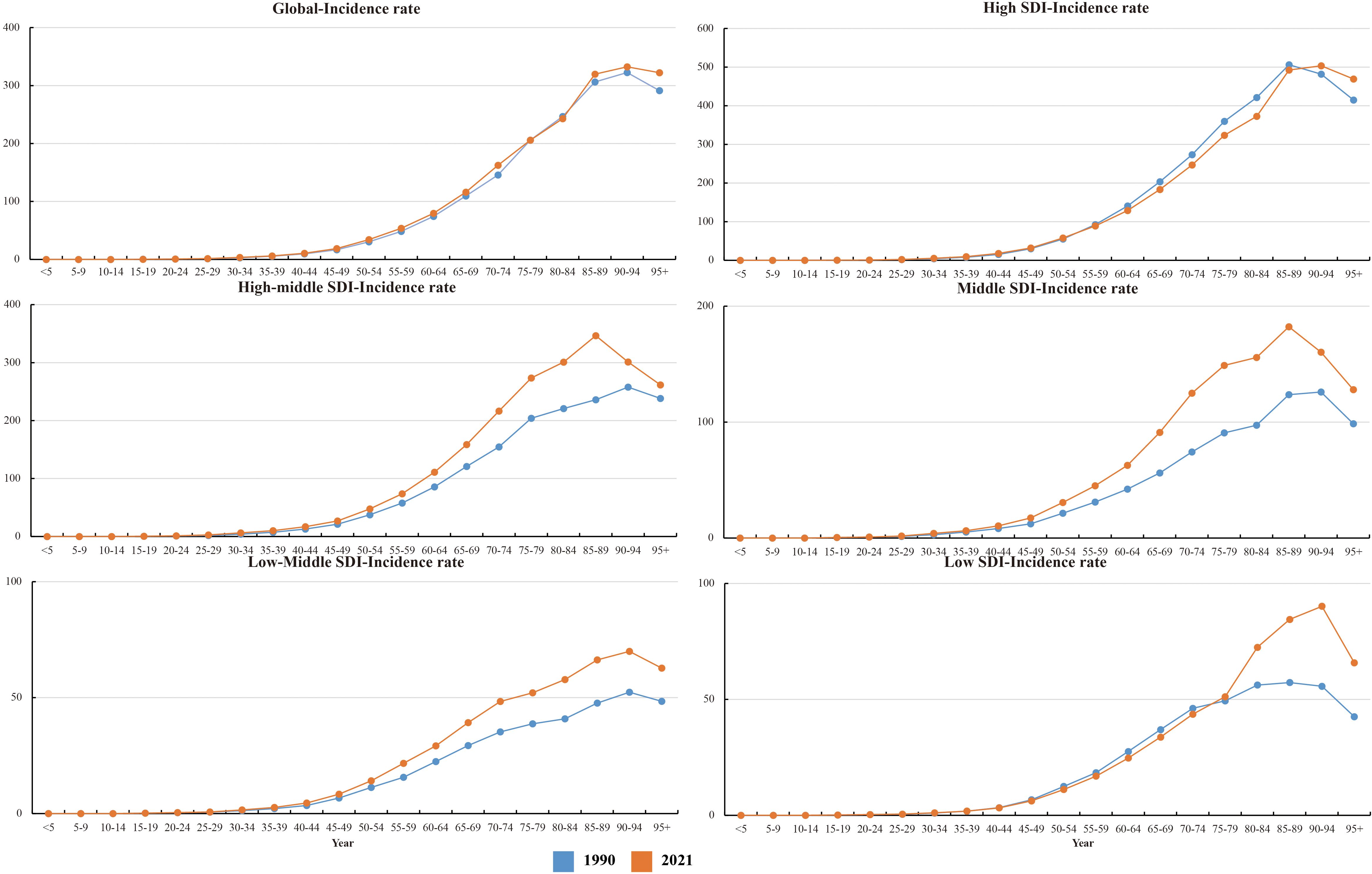 In 2021, global CRC incidence peaked in the 90–94 age group, rising consistently with age. Versus 1990, 2021 rates increased in 25–74 and 85+ groups but stabilized in 75–84 (Figure 6).Across most SDI regions, incidence rose in all age groups, except high SDI where 55–89 age rates declined. High SDI had higher rates overall, particularly ≥40 years, with rapid increases after 40 (Figure 1). Incidence was higher in women globally, but men in high, high-middle, and middle SDI regions showed marked acceleration (Figure 1). Mortality rates peaked in the ≥ 95 age group (Supplementary Figure S1), and DALY rates followed the same age pattern (Supplementary Figure S2). Global 2021 mortality rates were lower than in 1990 and rose with age. High SDI regions saw reduced mortality and DALY rates over 32 years; other SDI regions had increases.