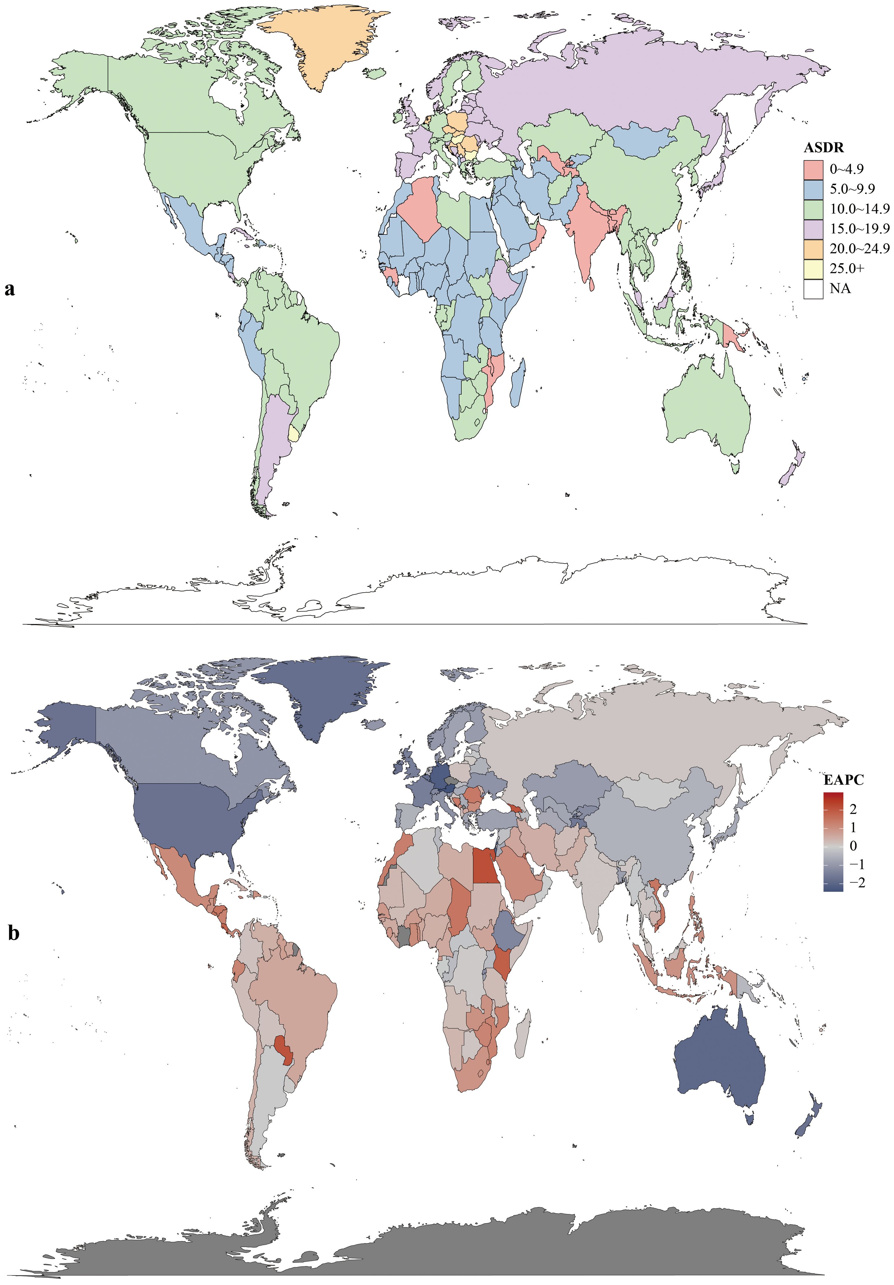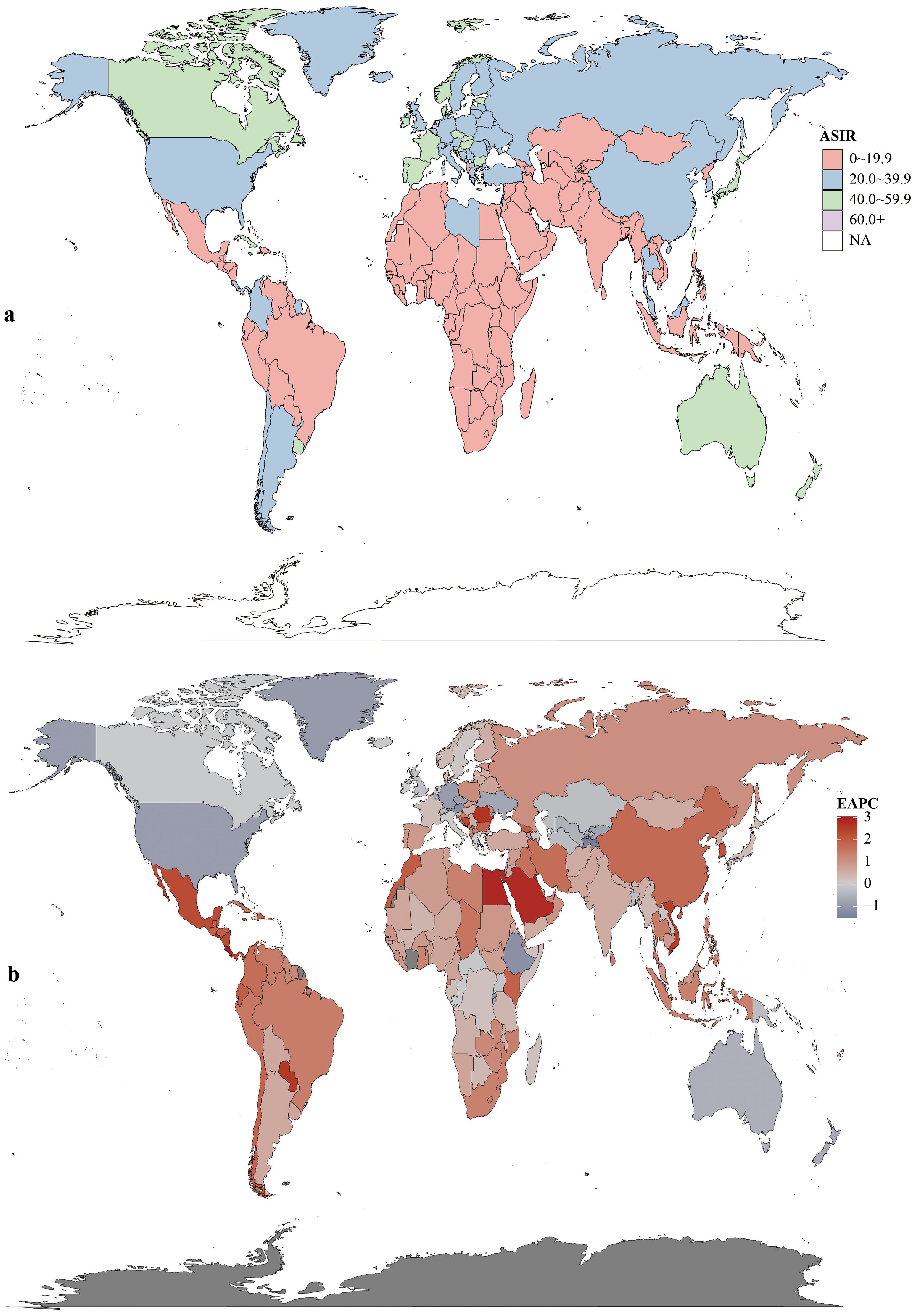 Figure 3. Incidence rates (a) and estimated annual percentage change (EAPC) (b) of colorectal cancer in 204 countries and territories.