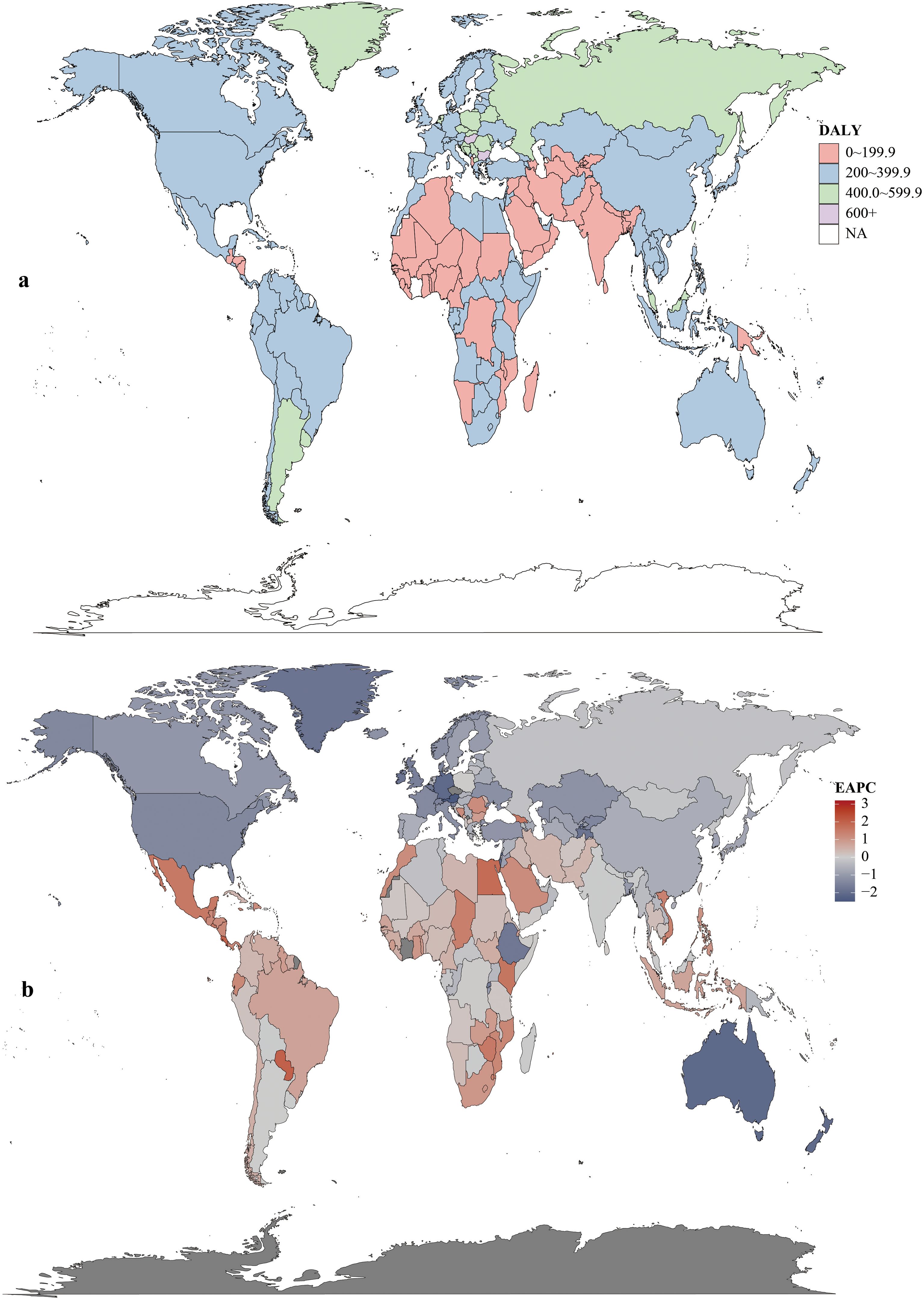 Figure 5. DALYs rates (a) and estimated annual percentage change (EAPC) (b) of colorectal cancer in 204 countries and territories.