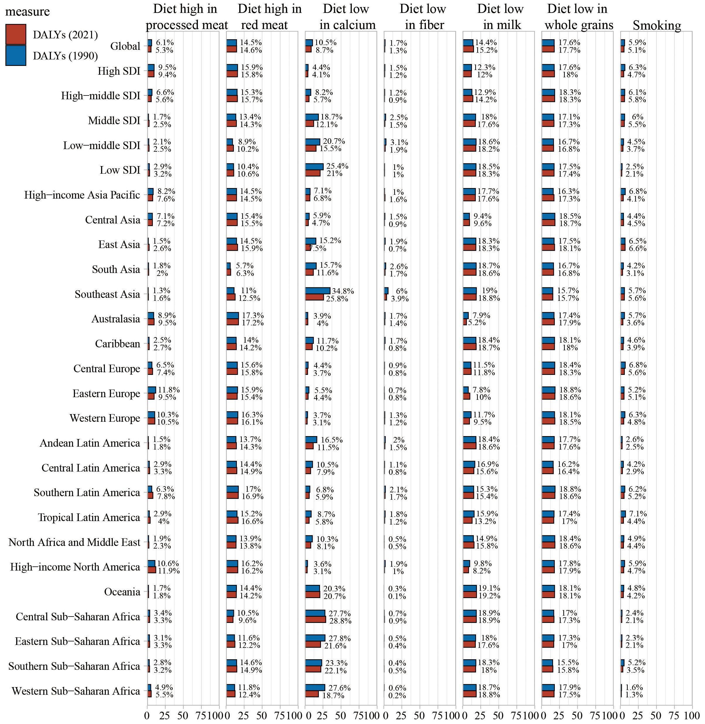 Supplementary Figure 4 | Level-2: Percentage contribution of risk factors to all-age DALYs of colorectal cancer in 2021, for both sexes, globally and by regions.