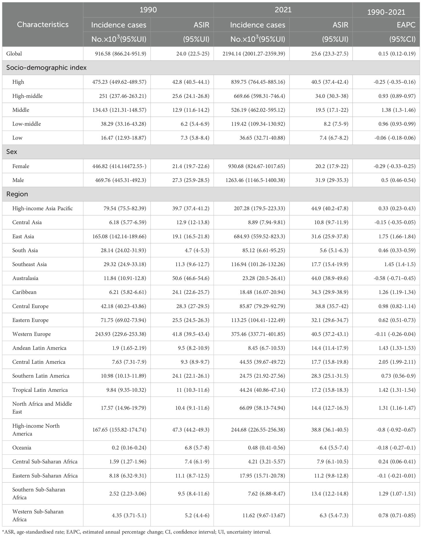 Among 21 GBD regions, incidence rose universally, with peak EAPC in Central Latin America (2.05, 95% CI:1.99–2.11) and trough in high-income North America (−0.8, 95% CI:−0.92 to −0.67). In 2021, high-income Asia Pacific (44.9 per 100,000, 95% UI:40.2–47.8) and Western Europe (44.0 per 100,000, 95% UI:38.9–49.6) had highest ASIR; low-income regions (Oceania:6.4; Western Sub-Saharan Africa:6.3; South Asia:5.6 per 100,000) the lowest.