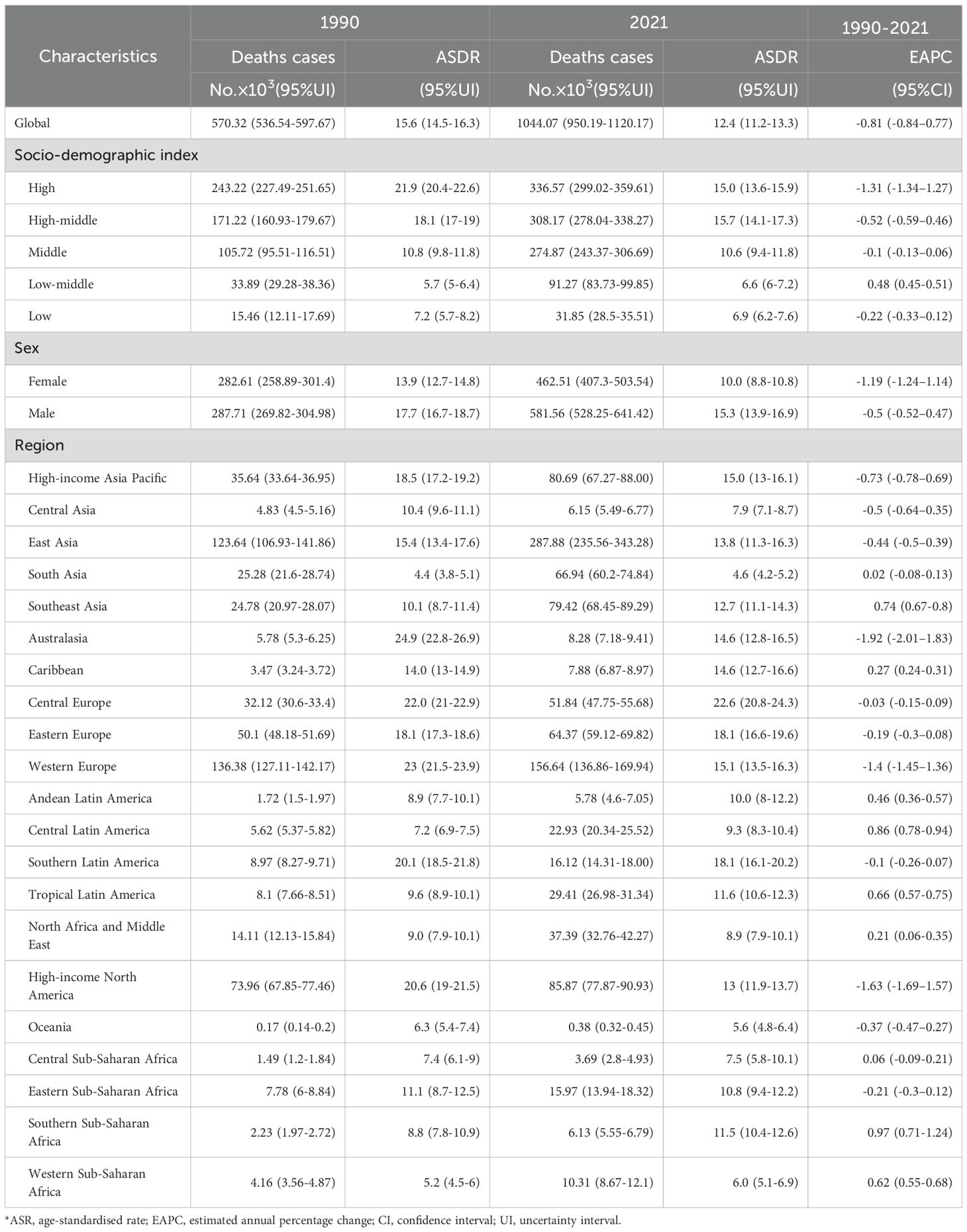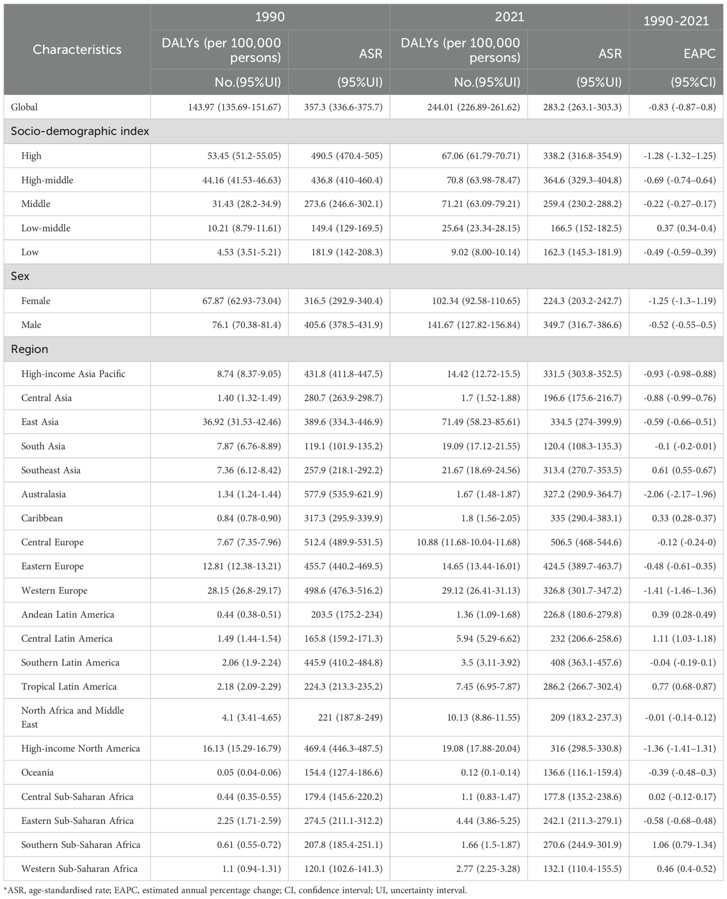 Among five SDI regions, high SDI had the highest ASDR (15.0, 95% UI:13.6–15.9); high-middle SDI had the highest age-standardized DALYs (364.6, 95% UI:329.3–404.8). Only low-middle SDI saw rising ASDR (EAPC = 0.48, 95% CI:0.45–0.51) and DALYs (EAPC = 0.37, 95% CI:0.34–0.40). High SDI showed the steepest declines: ASDR EAPC=–1.31 (95% CI:–1.34 to –1.27); DALYs EAPC=–1.28 (95% CI:–1.32 to –1.25) (Tables 2, 3).