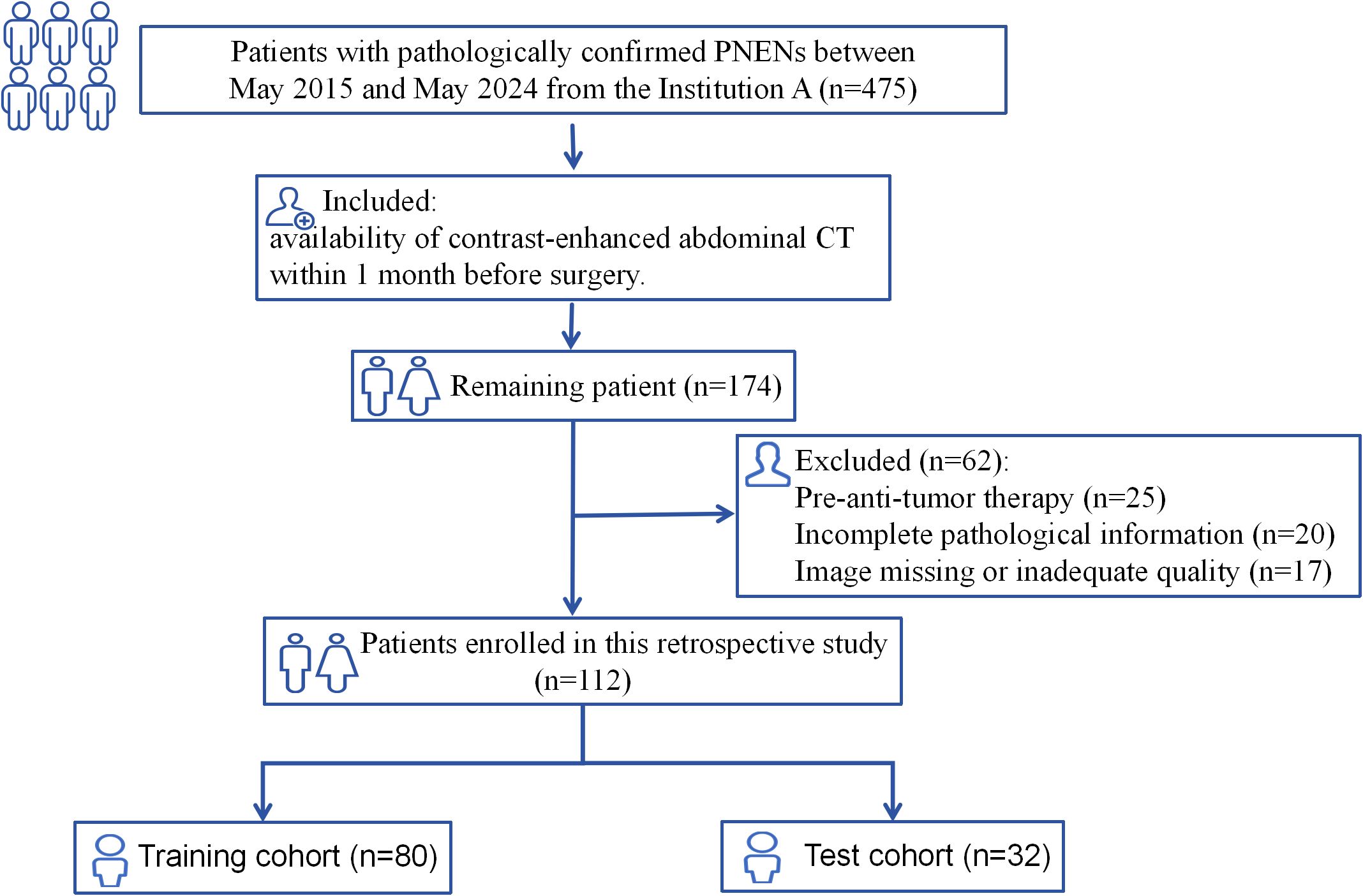Patients with pathologically confirmed PNETs treated at the First Affiliated Hospital of Guangxi Medical University between May 2015 and May 2024 were included. Exclusion criteria were: (1) local or systemic therapy before imaging, (2) Absence of preoperative CT or an interval exceeding 4 weeks between CT and surgery, (3) Missing pathological grade information, (4) Poor image quality unsuitable for analysis.