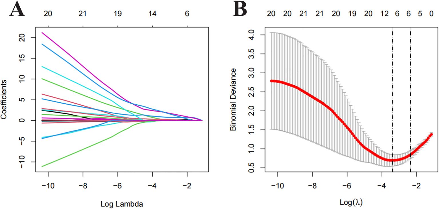 Figure 2. Least Absolute Shrinkage and Selection Operator (LASSO) regression analysis for feature selection. (A) Distribution of LASSO coefficients for different λ values. (B) Optimal λ values selected based on 10-fold cross-validation and minimum mean squared error (MSE), represented by vertical dashed lines.