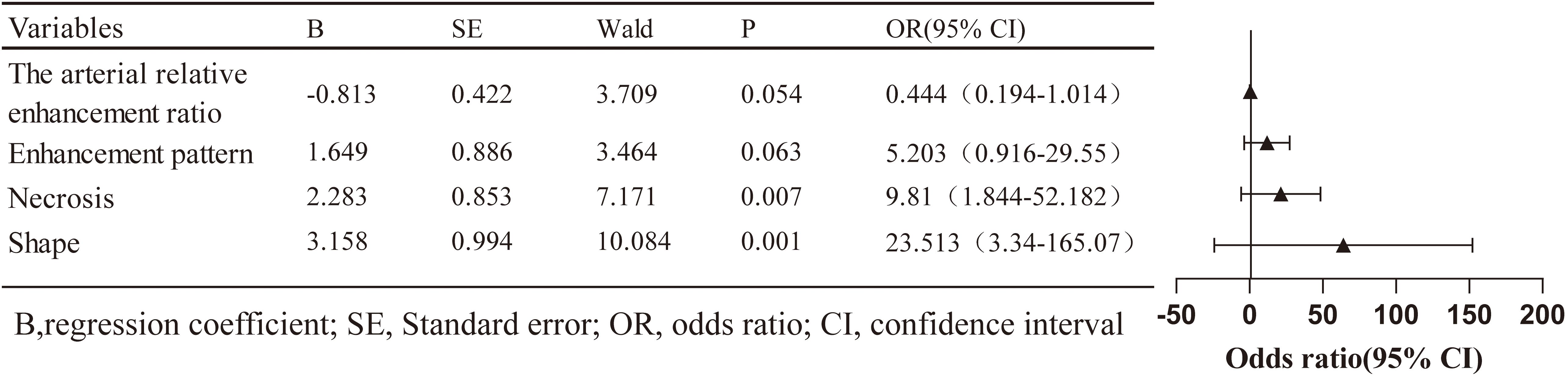 All clinical and imaging features were analysed using LASSO regression (Figure 2). The model identified 12 predictive factors using the minimum λ value of 0.034: tumour location, shape, margin, necrosis, pancreatic duct expansion, pancreatic atrophy, enhancement pattern, size, CA153, CA199, arterial absolute enhancement, and arterial relative enhancement ratio. To control for confounding variables, multivariable logistic regression identified tumour shape (OR = 23.513, 95% CI: 3.340–165.070), necrosis (OR = 9.810, 95% CI: 1.844–52.182), enhancement pattern (OR = 5.203, 95% CI: 0.916–29.550), and arterial relative enhancement ratio (OR = 0.444, 95% CI: 0.194–1.014) as independent predictors of invasiveness (Figure 3). These factors were incorporated into ML models.