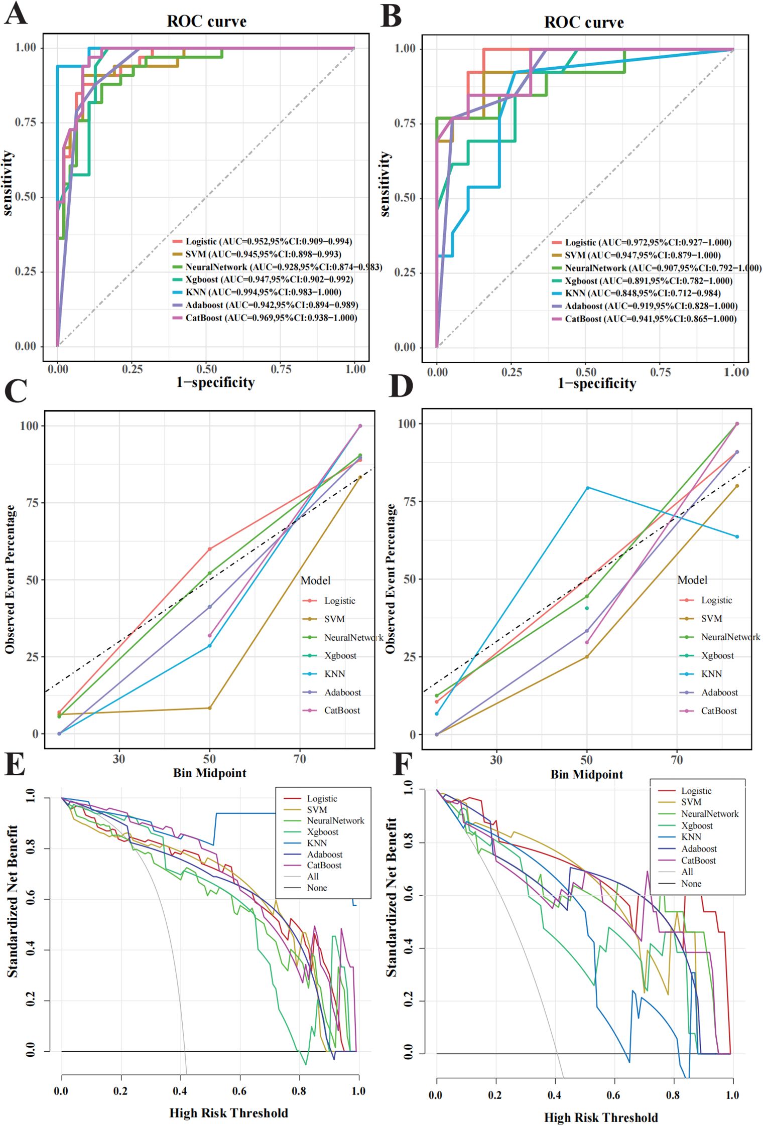 Figure 4. Performance evaluation of the machine learning model in predicting pancreatic neuroendocrine neoplasm invasiveness. (A) Receiver operating characteristic (ROC) curves for the training set. (B) ROC for the validation set. (C) Calibration curves for the training set, with the x-axis representing average predicted probability and the y-axis representing actual event probability. (D) Calibration curve for the validation set. (E) Decision Curve Analysis (DCA) curves for the training set. (F) DCA curve for the validation set.