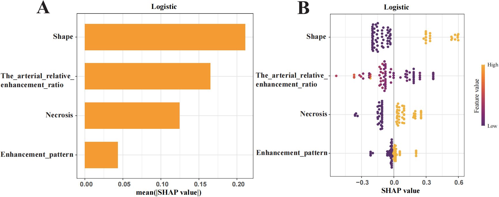 To enhance interpretability, SHAP values were used to assess features importance. The top-ranked predictors in the logistic regression model were tumour shape, arterial relative enhancement ratio, necrosis, and enhancement pattern (Figure 5A). The SHAP bee swarm plot (Figure 5B) illustrates the contribution of each feature, with purple indicating a negative effect and yellow indicating a positive effect on the predicted probability. Each point represents a patient’s SHAP value, with the density of the points reflecting the distribution of the same SHAP value. The points are coloured according to the feature values, ranging from low (purple) to high (yellow). For instance, patients with irregular shapes or lower arterial relative enhancement ratios are more likely to have invasive tumours. The SHAP dependency plot (Figure 6) demonstrates that lower arterial relative enhancement ratios correlated with increased tumour invasiveness. Irregular tumour shape and necrosis also correlated with increased SHAP values.