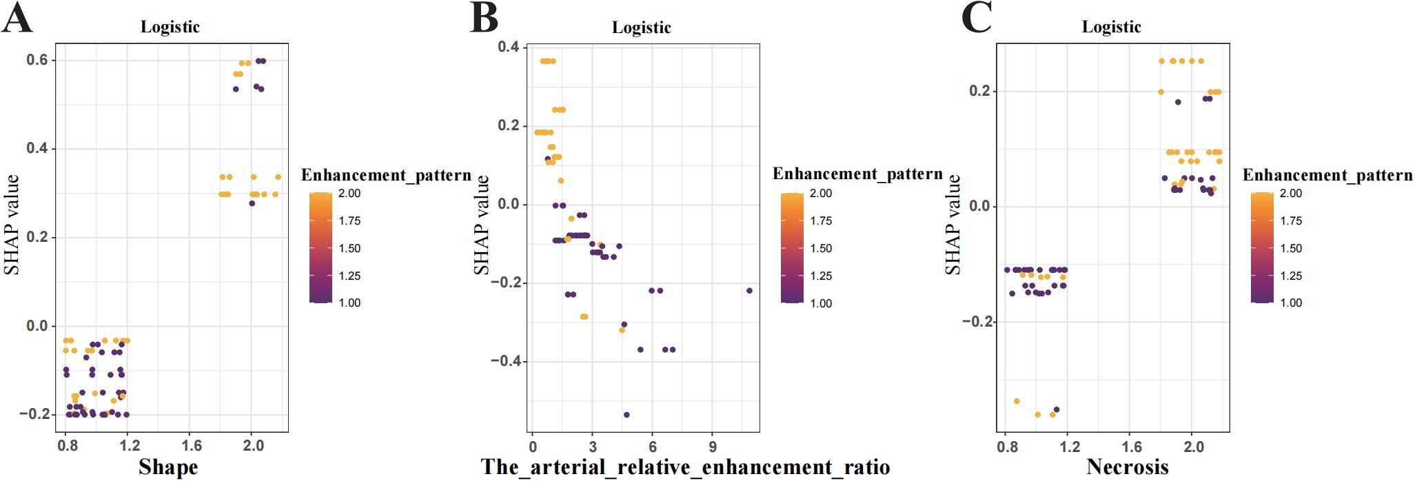 Figure 6. Shapley Additive Explanations (SHAP) dependence plot shows the influence of individual features on model predictions. (A) Tumour shape (B) Arterial relative enhancement ratio change (C) Tumour necrosis. The y-axis represents SHAP values, while the x-axis displays specific feature values. Each point represents the SHAP value for a patient, with the colour gradient from yellow to purple indicating high to low feature values. A SHAP value >0 indicates an increased risk of tumour aggressiveness.