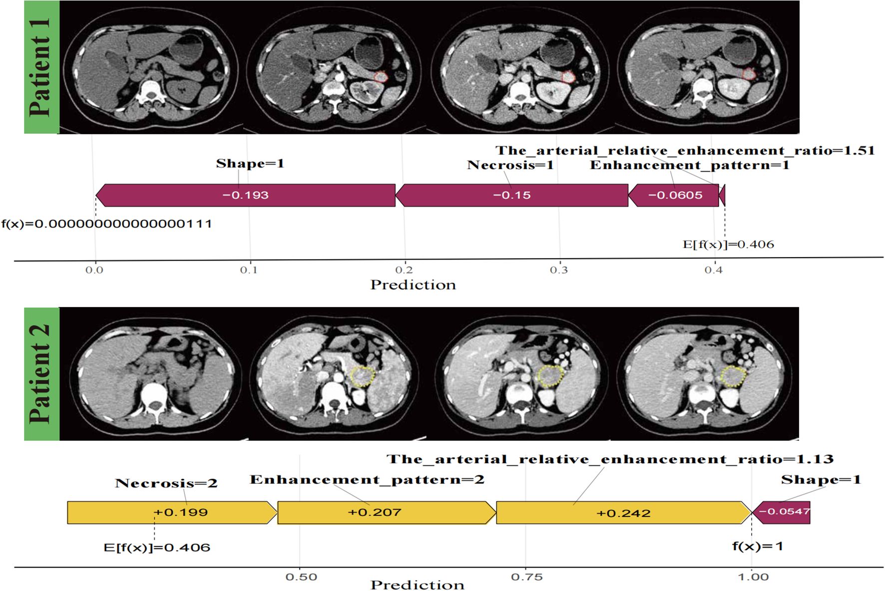 This study identified four CT features as independent predictors of PNETs aggressiveness, ranked by SHAP analysis: tumour shape, arterial relative enhancement ratio, necrosis-cystic changes, and enhancement pattern. Irregular tumour margins were strongly associated with invasion and lymphatic spread, aligning with previous studies. Irregular margins are significantly correlated with tumour size, high histological grade, liver metastases, and lymph node metastasis (29). Zhu et al. (30) reported that tumours with irregular margins were 4.72 times more likely to develop malignant lymph nodes compared to those with smooth margins, further reinforcing the association between irregular borders and PNETsaggressiveness. Irregularly shaped tumours with incomplete capsules exhibit a higher likelihood of lymphatic or vascular invasion, which is strongly associated with poor prognosis, increased metastasis risk, and greater treatment resistance, significantly reducing overall survival (29).