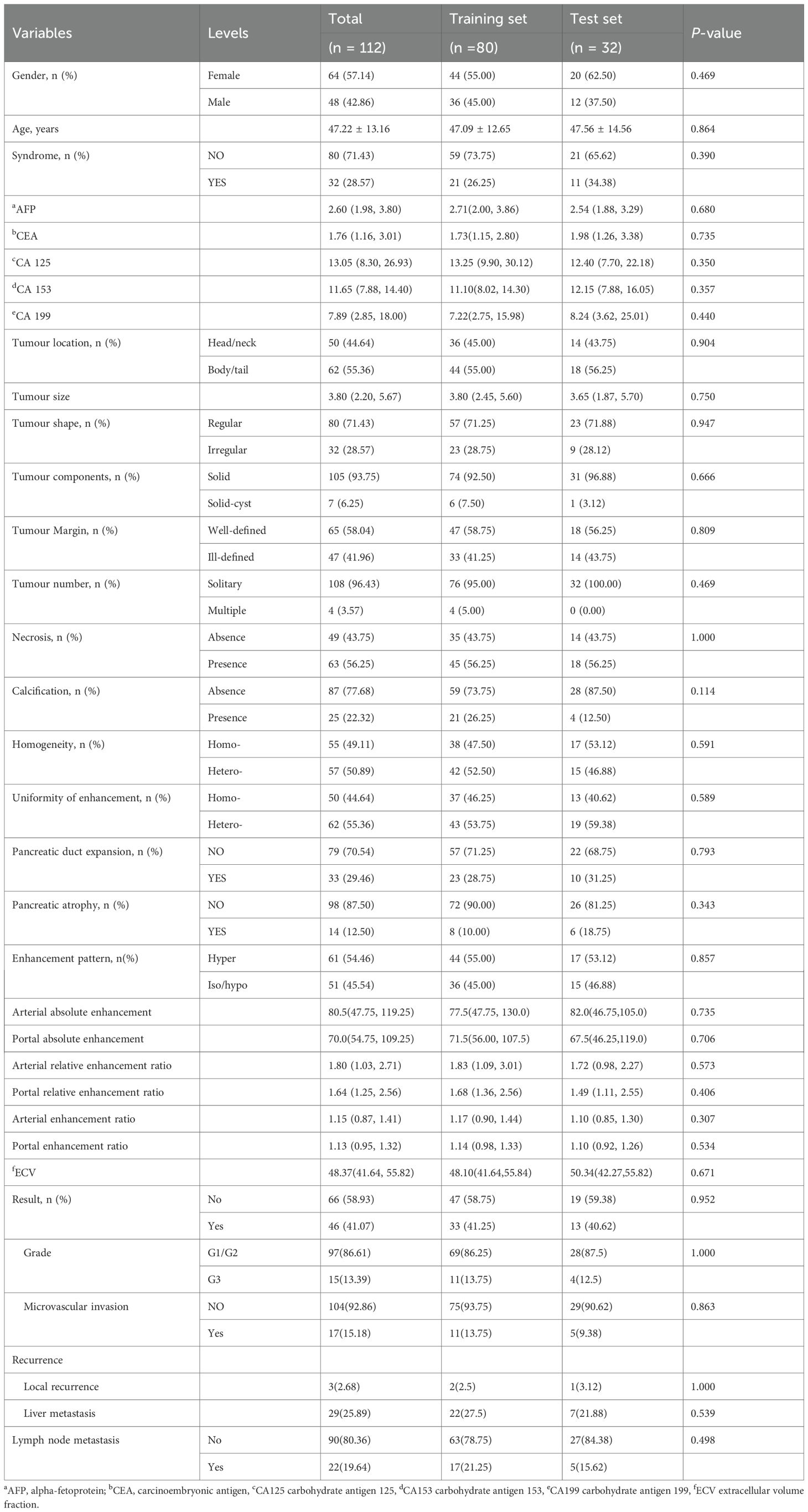 The study included 112 patients, randomly divided into training (n = 80; mean age, 47 ± 13 years; 36 males) and test (n = 32; mean age, 48 ± 15 years; 12 males) sets. The proportion of aggressive tumours was 41.25% (33/80) and 40.62% (13/32) in the training and test sets, respectively. In the training set, the aggressive group included patients with G3 grading (n = 11), lymph node metastasis (n = 17), microvascular invasion (n = 5), preoperative distant metastasis or postoperative recurrence (n = 24). Liver metastasis was the most common site of recurrence (n = 22), followed by local recurrence (n = 2). Similarly, in the test set, the aggressive group included patients with G3 grading (n = 4), lymph node metastasis (n = 5), microvascular invasion (n = 3), and preoperative distant metastasis or postoperative recurrence (n = 8). Liver involvement was again the predominant site (n = 7), followed by local recurrence (n = 1). The sum of individual components exceeded the number of aggressive cases in both cohorts because some patients had multiple aggressiveness endpoints. No significant differences were observed between the training and test cohorts (Table 1).