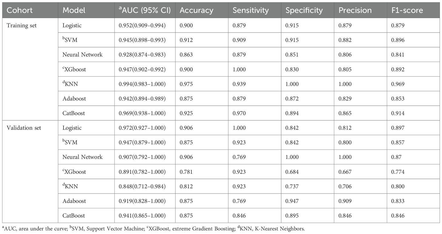 Model performance metrics, including AUC, accuracy, F1 score, sensitivity, and specificity, are summarised in Table 2. In the training set, the KNN classifier yielded the highest AUC (0.994; 95% CI, 0.983–1.000), followed by CatBoost (0.969; 95% CI, 0.938–1.000) and logistic regression (0.952; 95% CI, 0.909–0.994), with SVM, XGBoost, Neural Network, and Adaboost slightly lower. In the validation set, the logistic regression model achieved the highest AUC (0.972, 95% CI: 0.927–1.000), followed by SVM (0.947, 95% CI: 0.879–1.000), CatBoost (0.941, 95% CI: 0.865–1.000), Neural Network (0.907, 95% CI: 0.792–1.000), Adaboost (0.919, 95% CI: 0.828–1.000), XGBoost (0.891, 95% CI: 0.782–1.000), and KNN (0.848, 95% CI: 0.712–0.984). Regarding accuracy, the logistic regression model, SVM, Neural Network, XGBoost, KNN, Adaboost, and CatBoost achieved 90.6%, 87.5%, 90.6%, 78.1%, 81.2%, 87.5%, and 87.5% accuracy, respectively. Logistic regression also achieved the highest F1 score (0.897), balanced sensitivity (100%) and specificity (0.842) in the validation cohort.